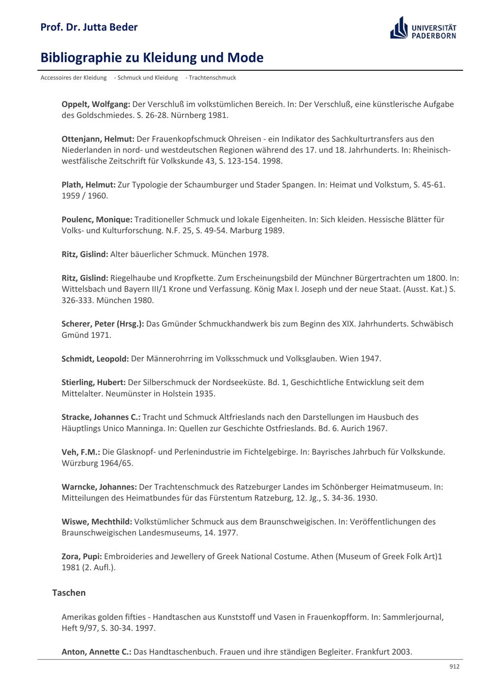 Bibliographie zu Kleidung und Mode / Prof. Dr. Jutta Beder