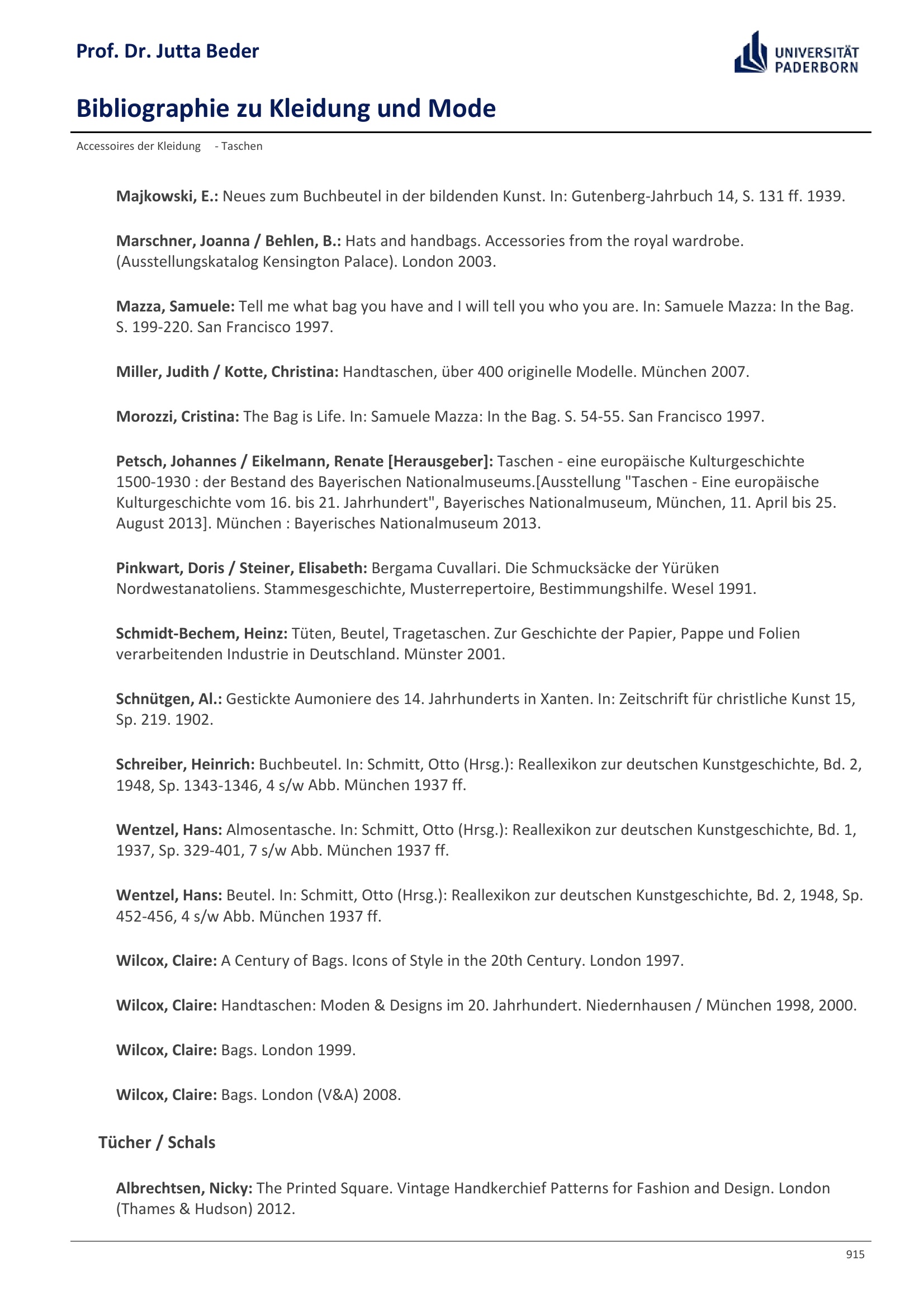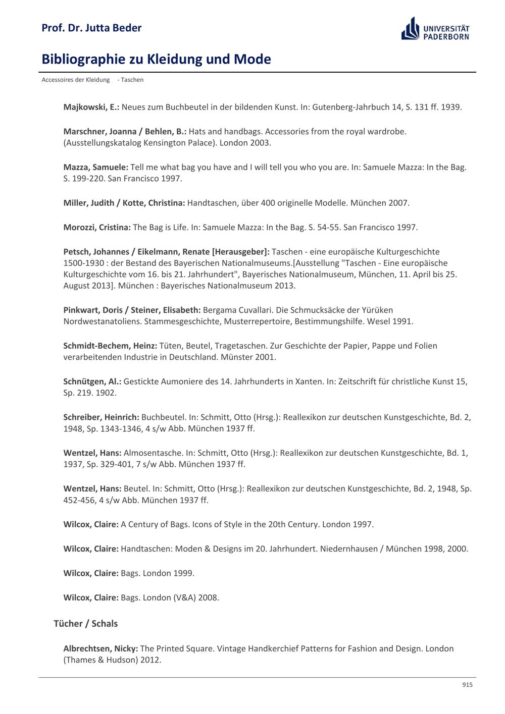 Bibliographie zu Kleidung und Mode / Prof. Dr. Jutta Beder