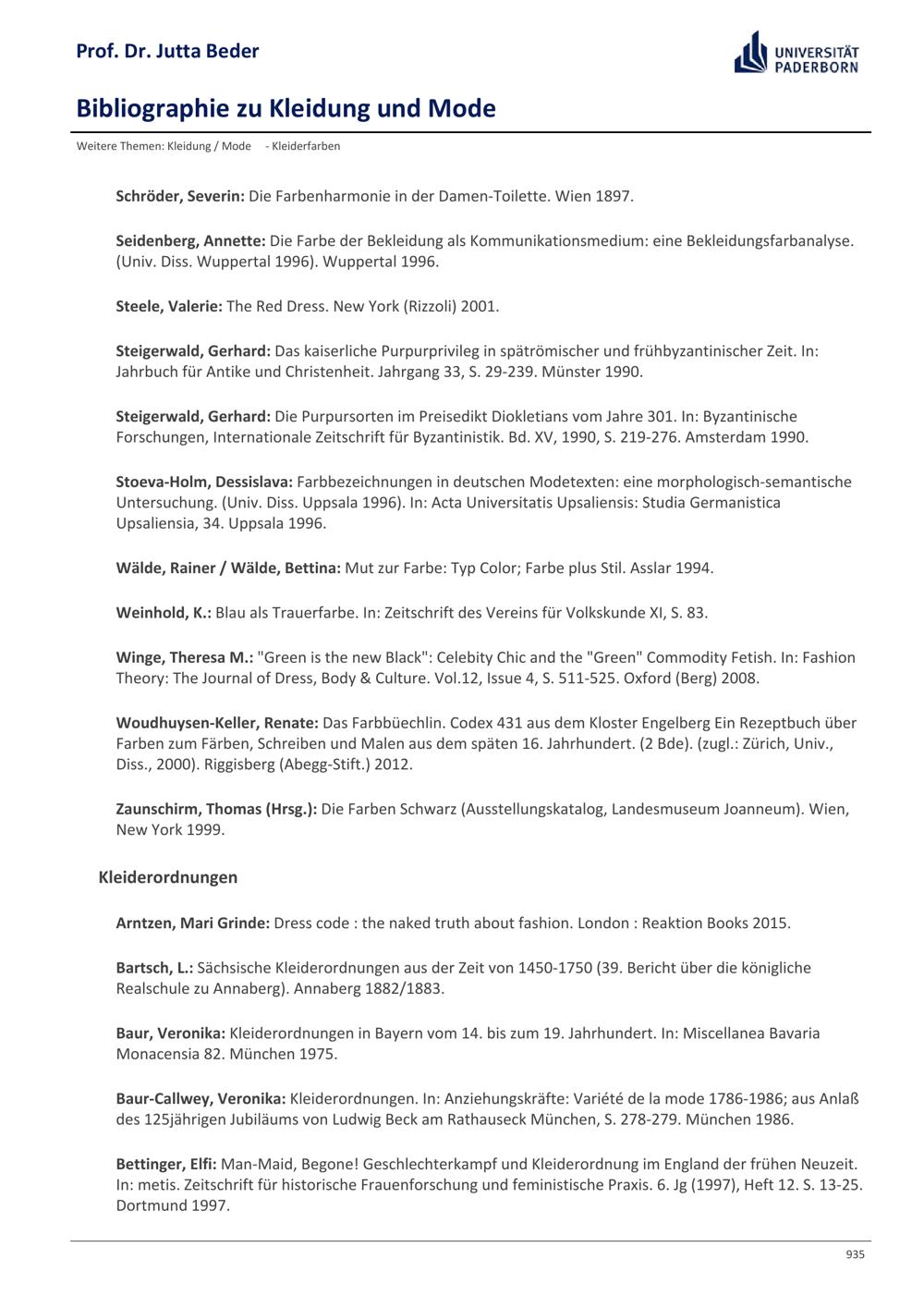 Bibliographie zu Kleidung und Mode / Prof. Dr. Jutta Beder