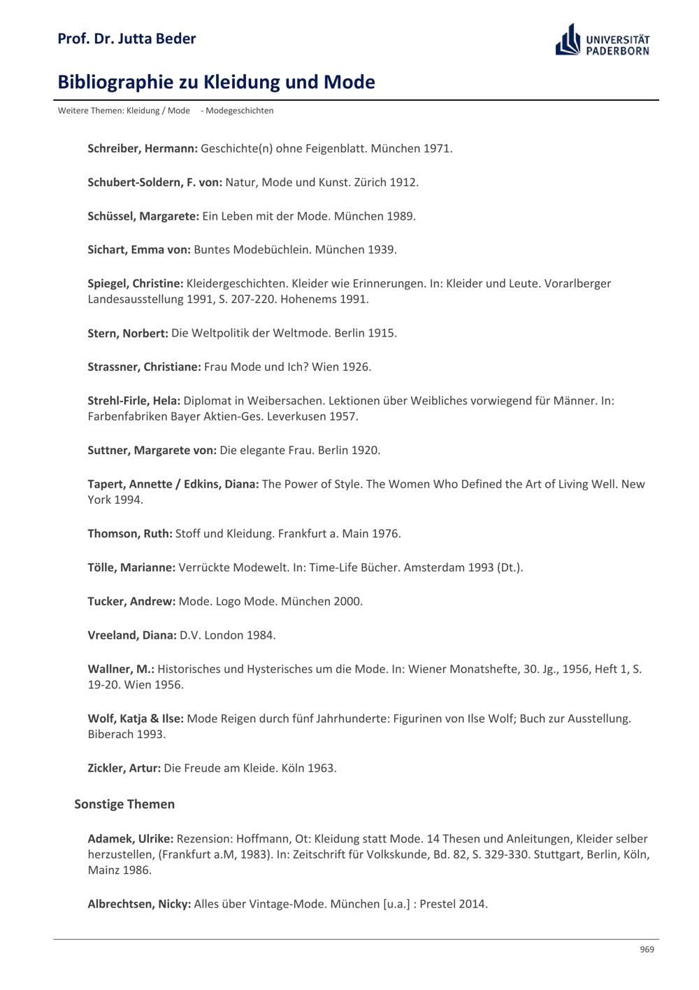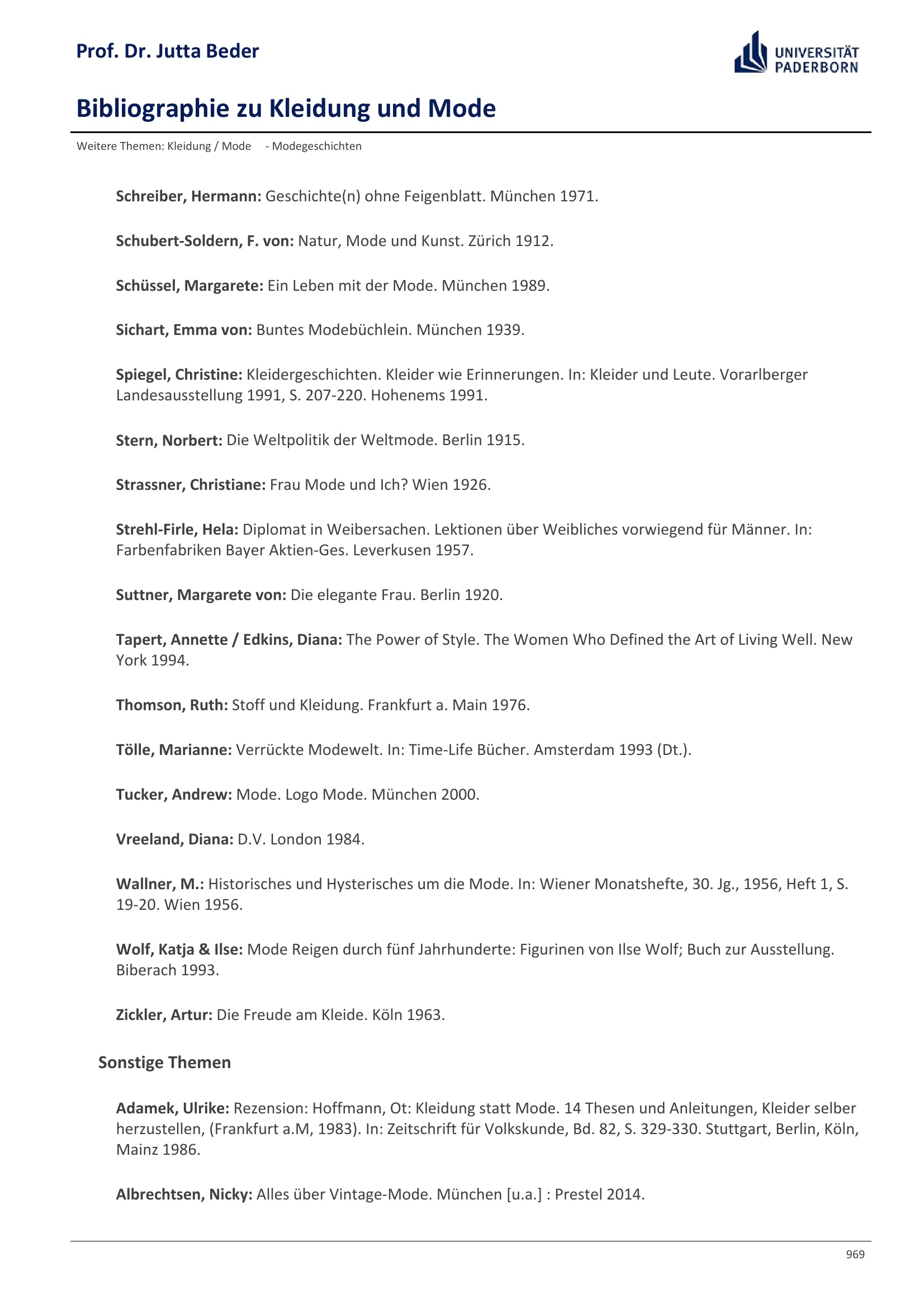Bibliographie zu Kleidung und Mode / Prof. Dr. Jutta Beder