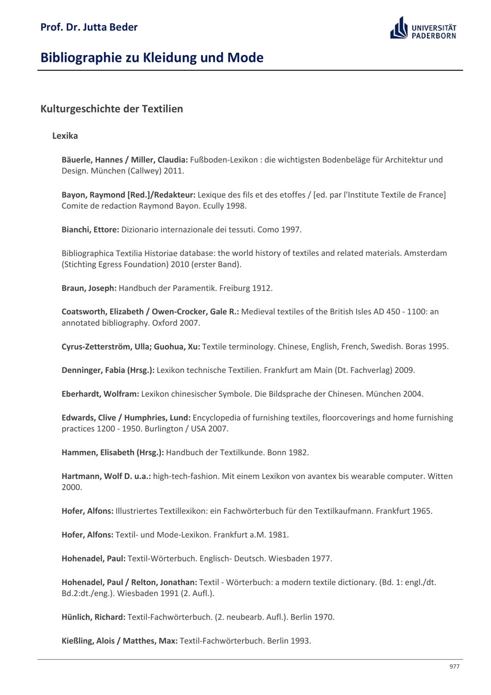 Bibliographie zu Kleidung und Mode / Prof. Dr. Jutta Beder
