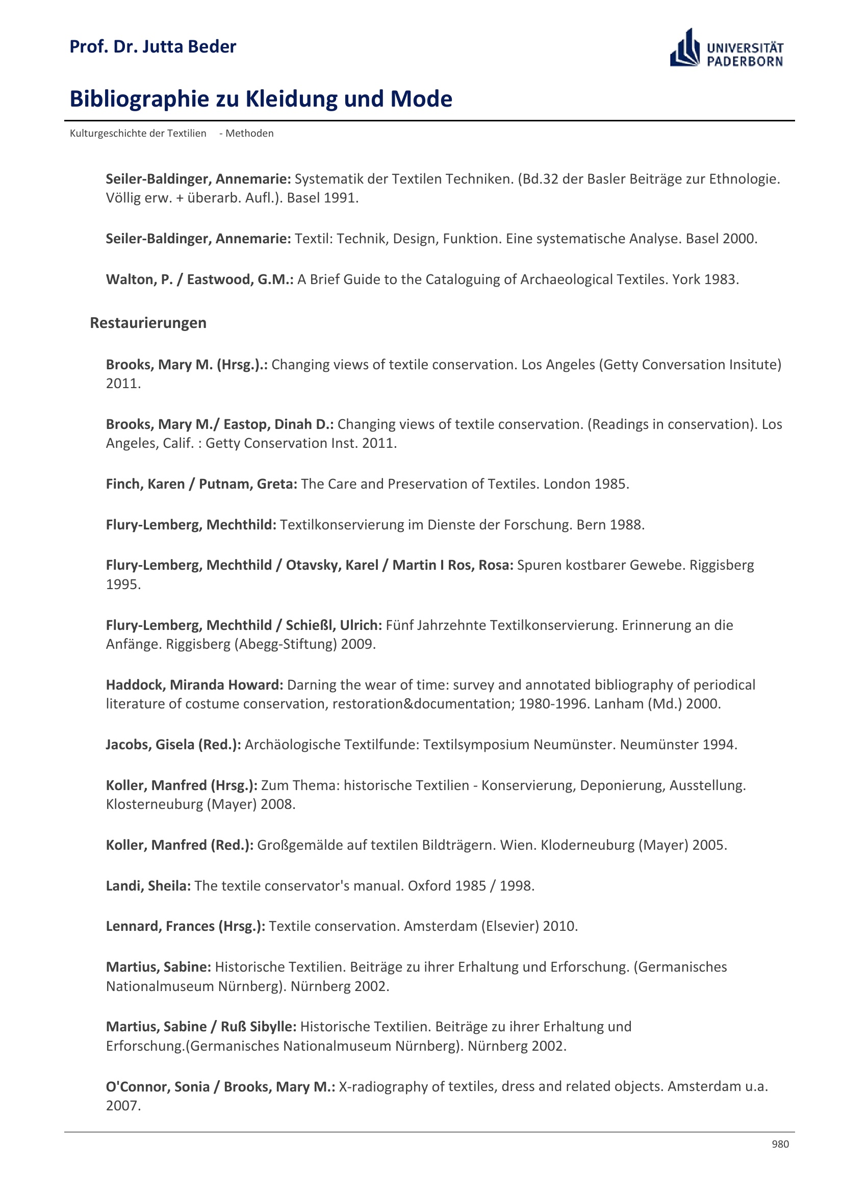 Bibliographie zu Kleidung und Mode / Prof. Dr. Jutta Beder