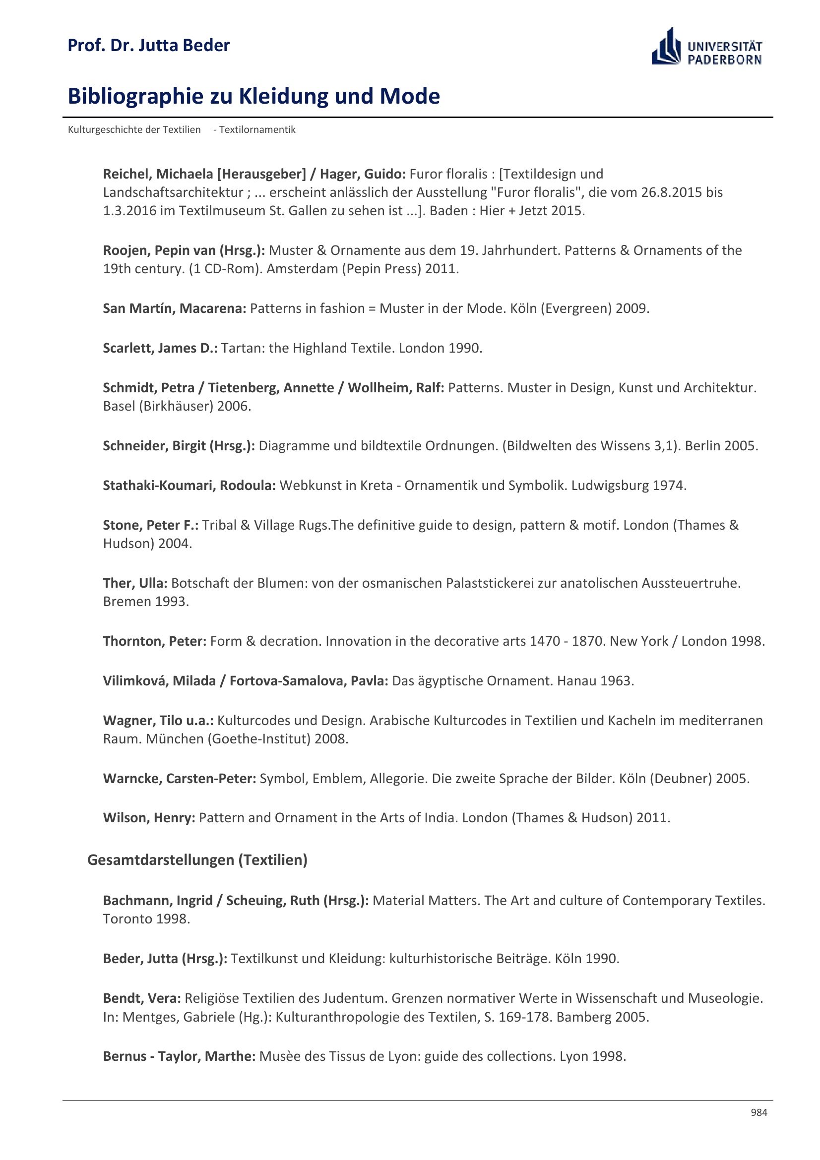 Bibliographie zu Kleidung und Mode / Prof. Dr. Jutta Beder