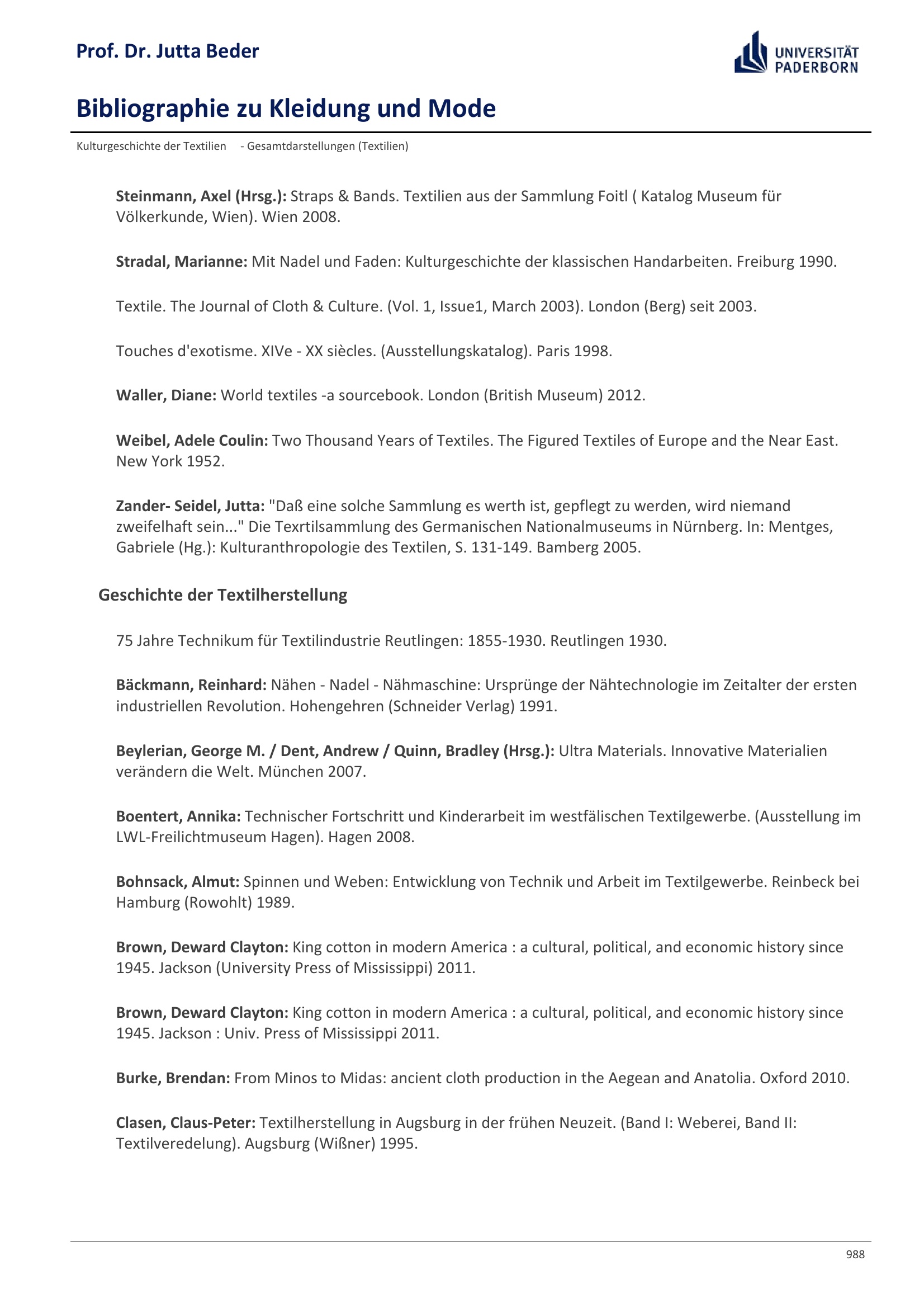 Bibliographie zu Kleidung und Mode / Prof. Dr. Jutta Beder