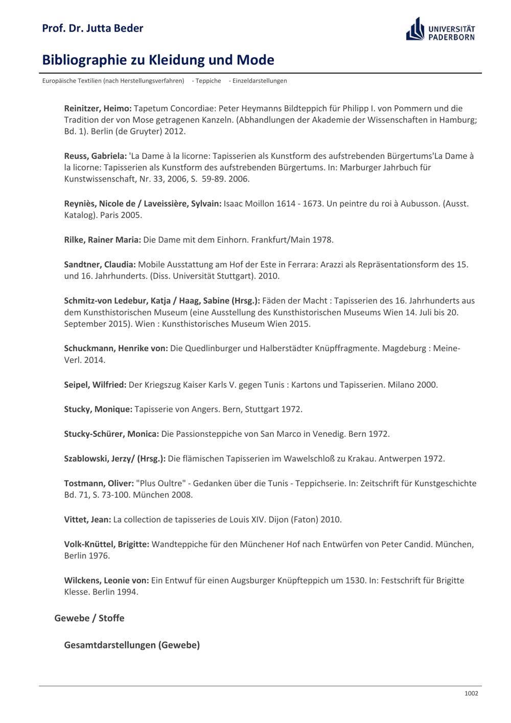 Bibliographie zu Kleidung und Mode / Prof. Dr. Jutta Beder