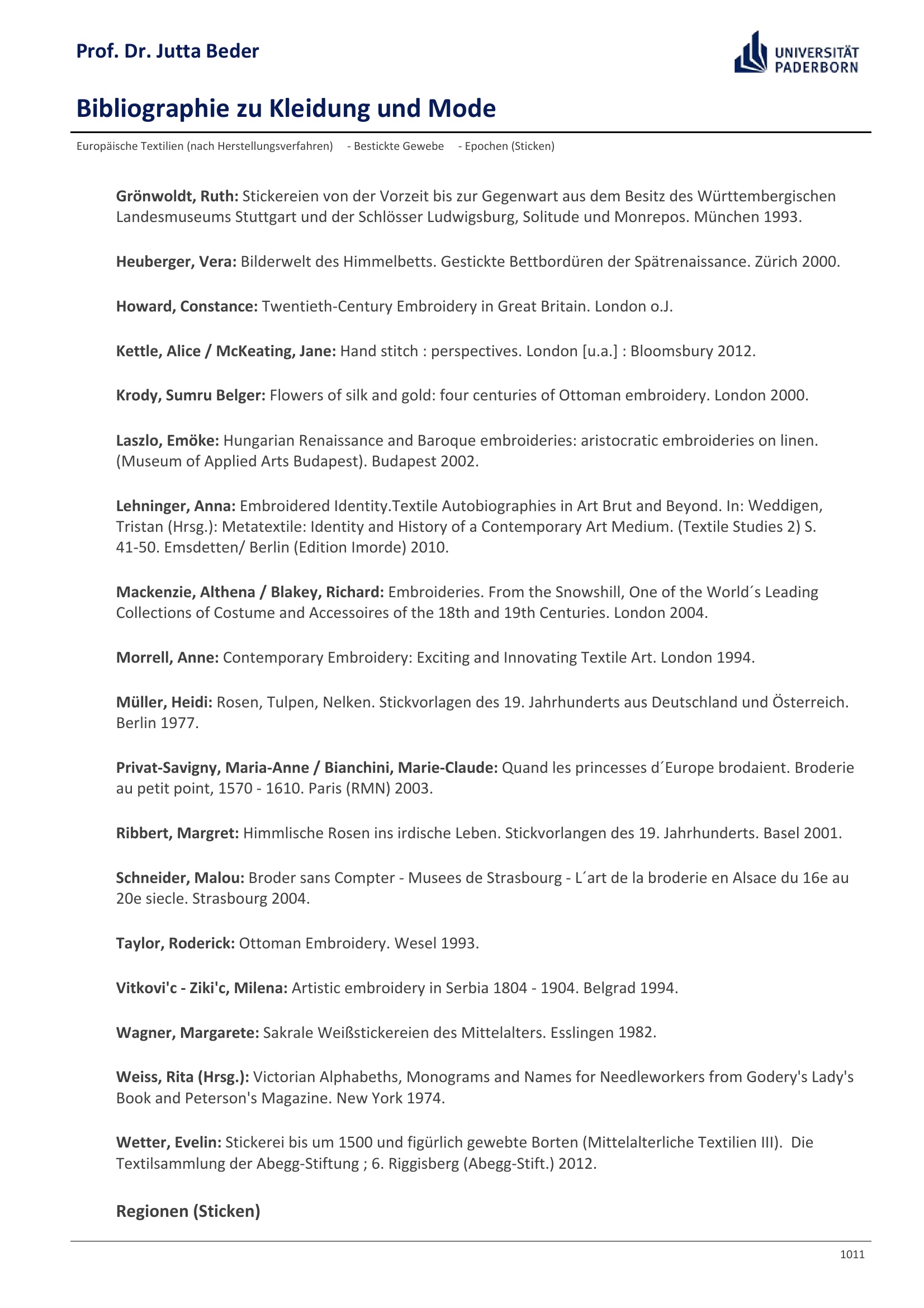 Bibliographie zu Kleidung und Mode / Prof. Dr. Jutta Beder