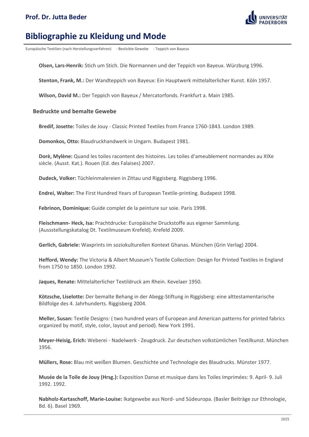Bibliographie zu Kleidung und Mode / Prof. Dr. Jutta Beder
