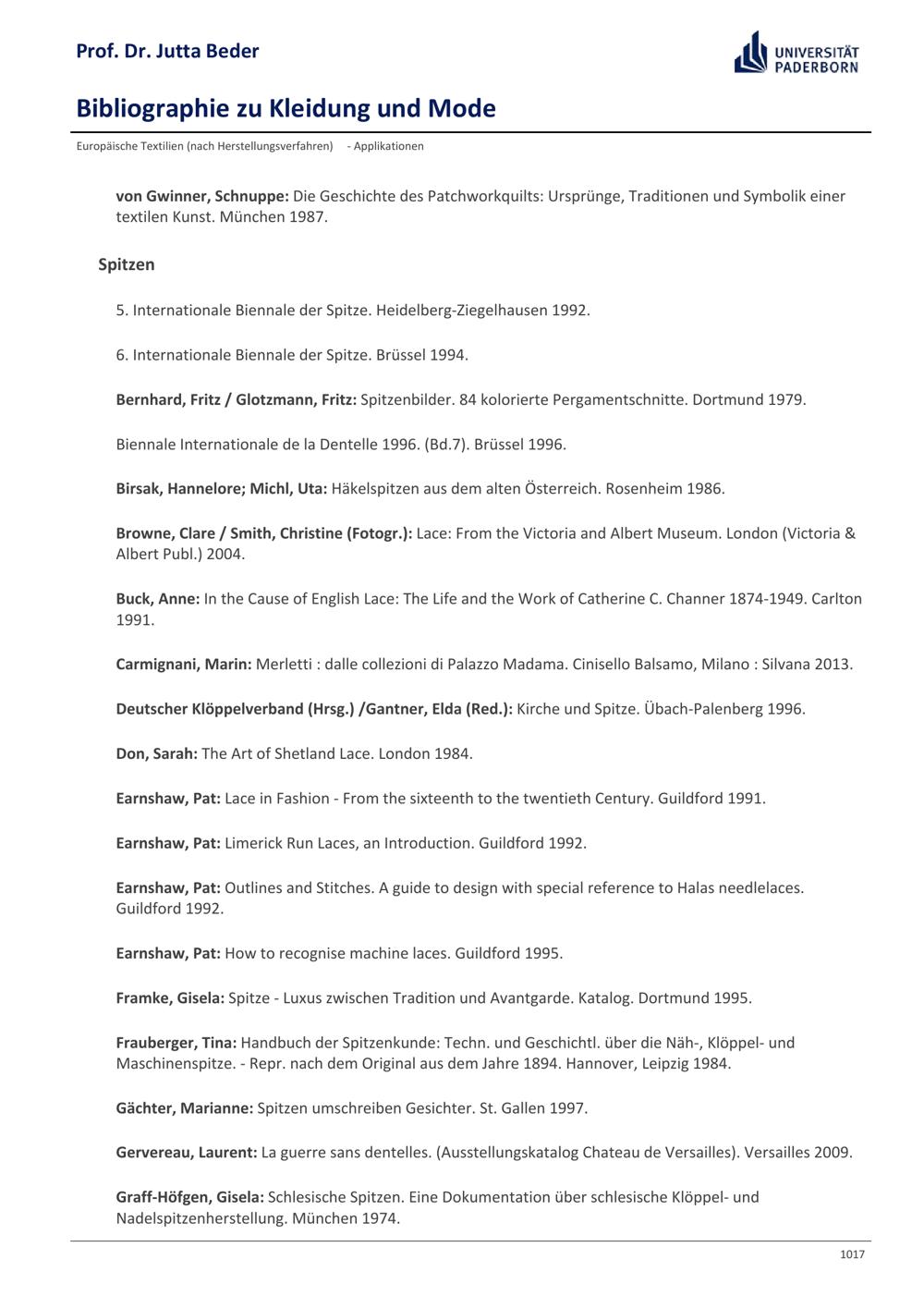Bibliographie zu Kleidung und Mode / Prof. Dr. Jutta Beder