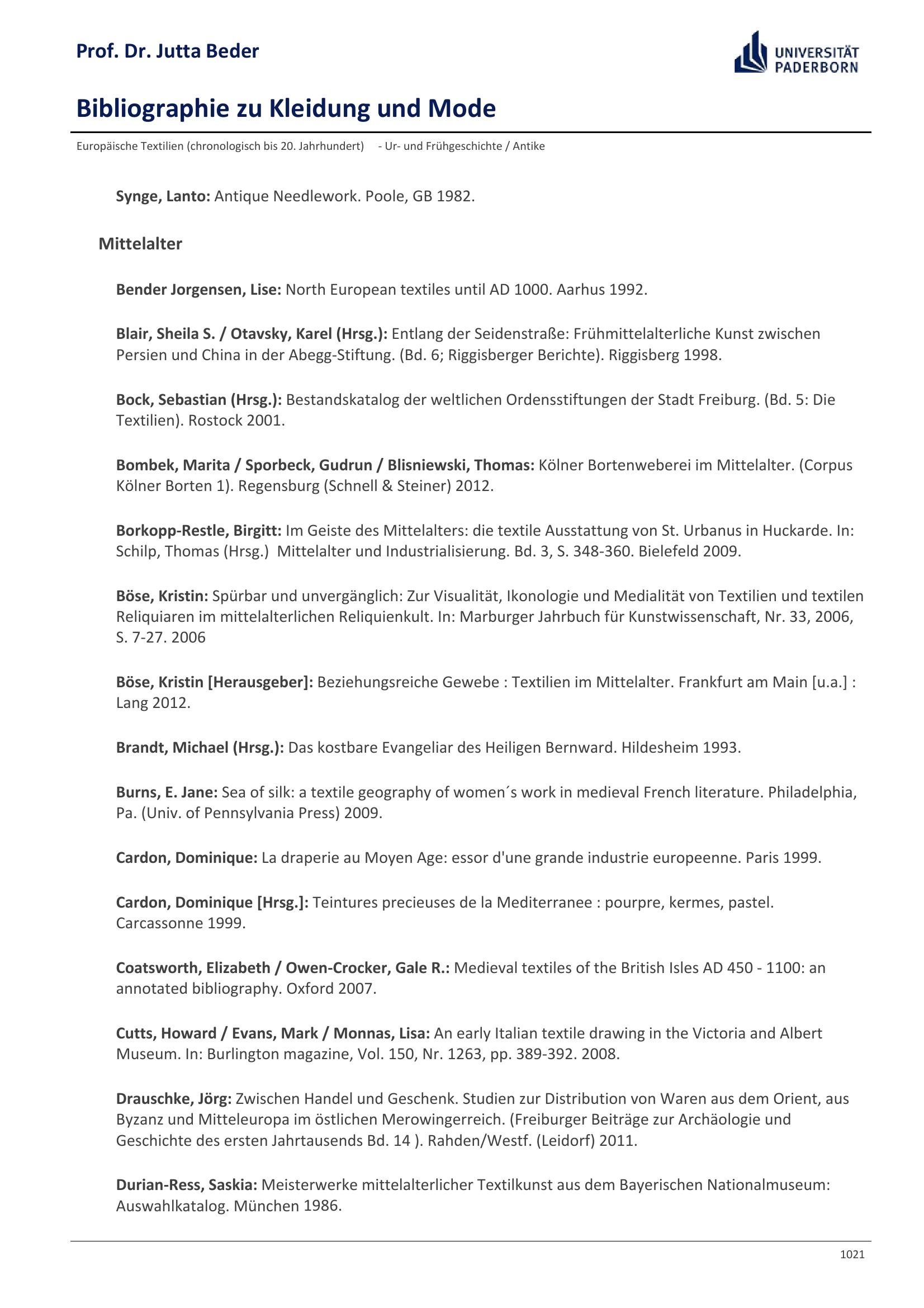 Bibliographie zu Kleidung und Mode / Prof. Dr. Jutta Beder