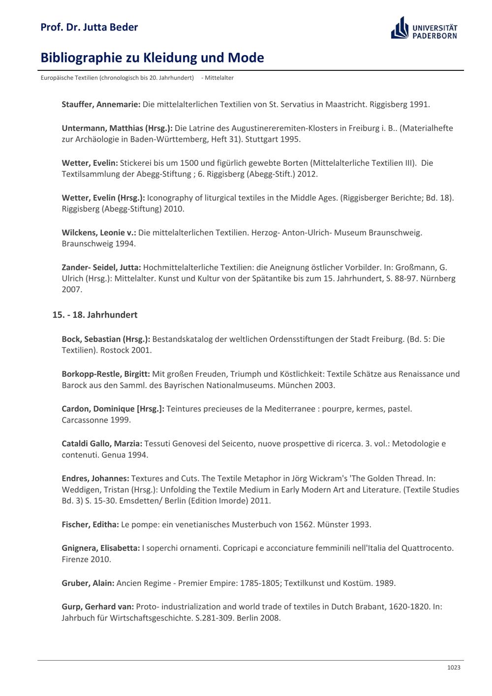 Bibliographie zu Kleidung und Mode / Prof. Dr. Jutta Beder