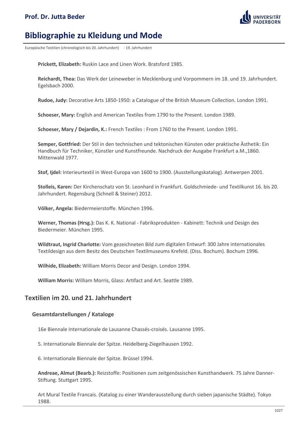 Bibliographie zu Kleidung und Mode / Prof. Dr. Jutta Beder