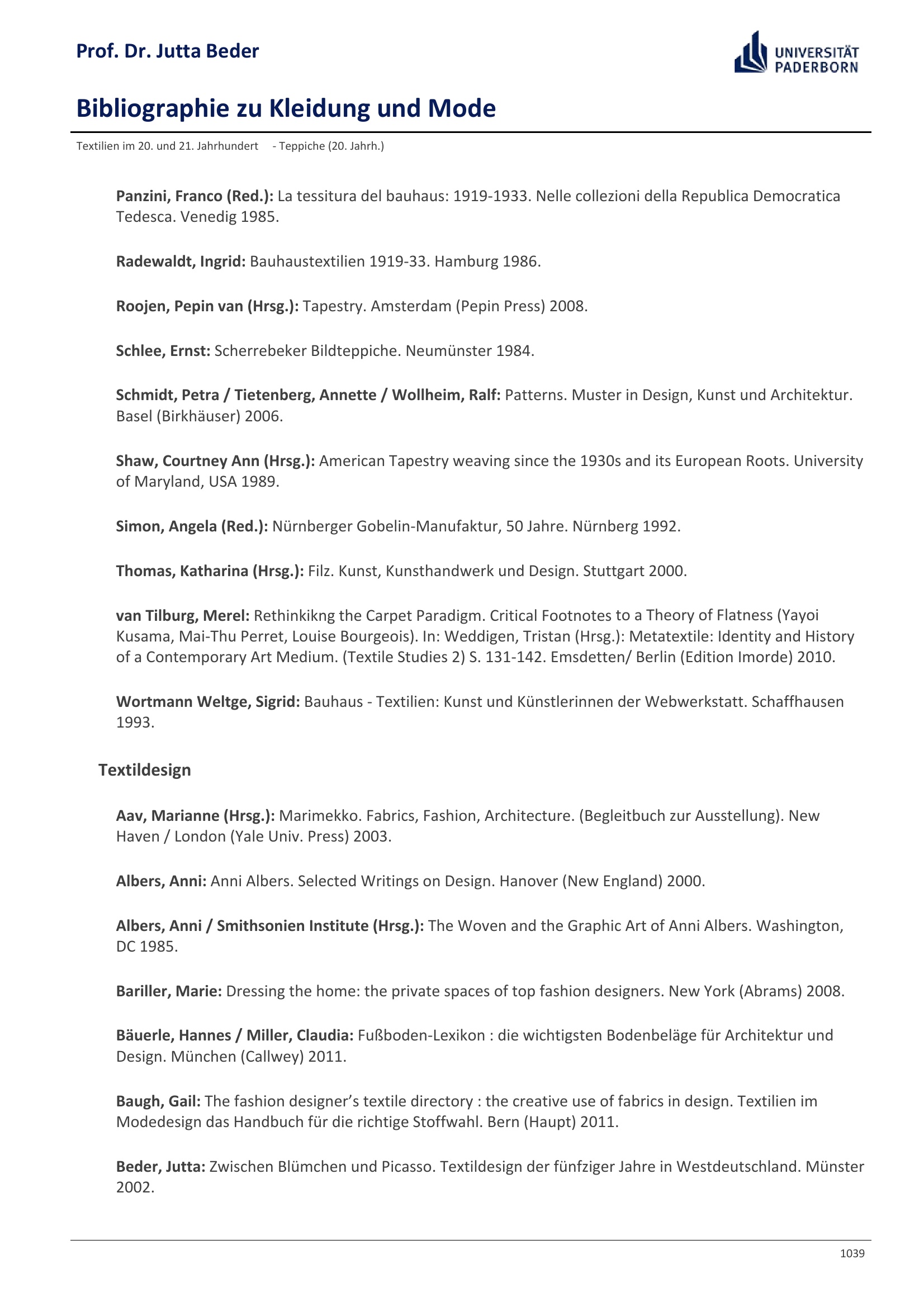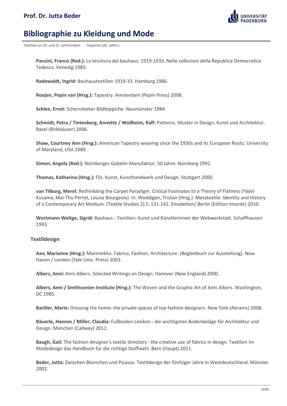 Bibliographie zu Kleidung und Mode / Prof. Dr. Jutta Beder