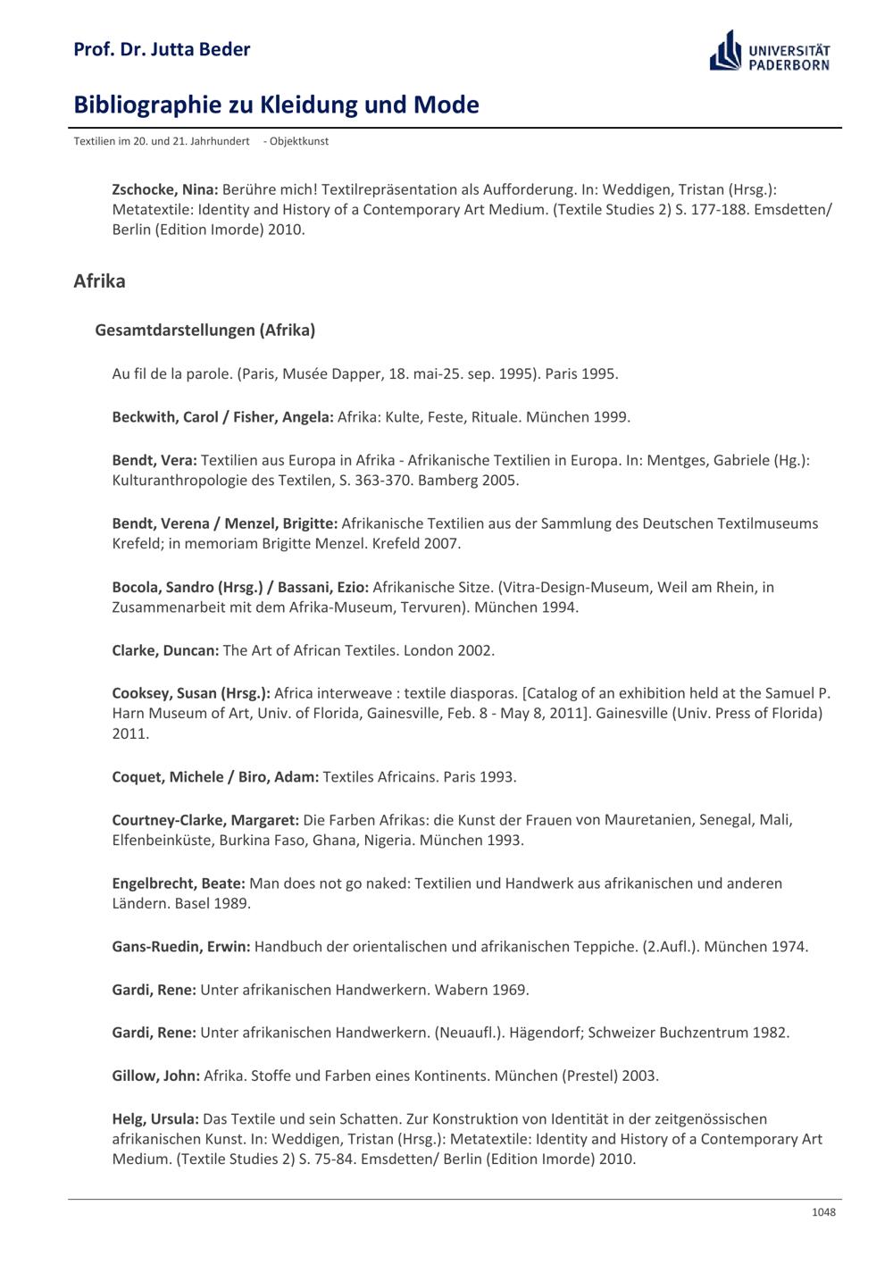 Bibliographie zu Kleidung und Mode / Prof. Dr. Jutta Beder