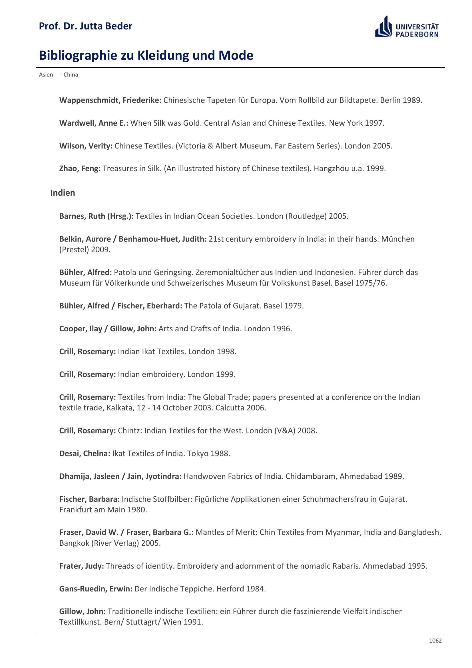 Bibliographie zu Kleidung und Mode / Prof. Dr. Jutta Beder
