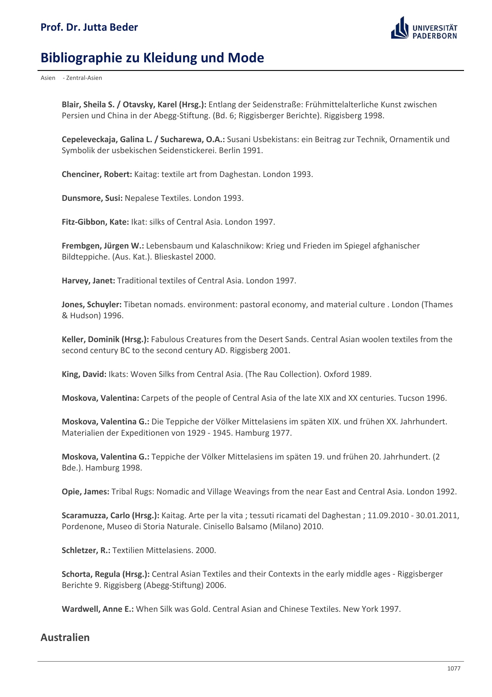 Bibliographie zu Kleidung und Mode / Prof. Dr. Jutta Beder