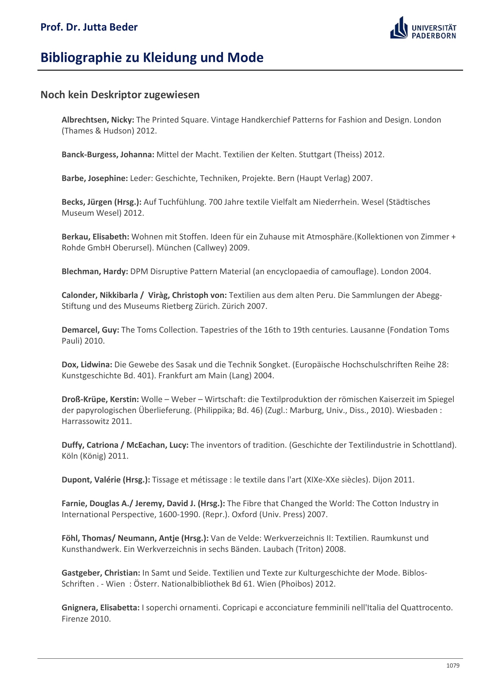 Bibliographie zu Kleidung und Mode / Prof. Dr. Jutta Beder
