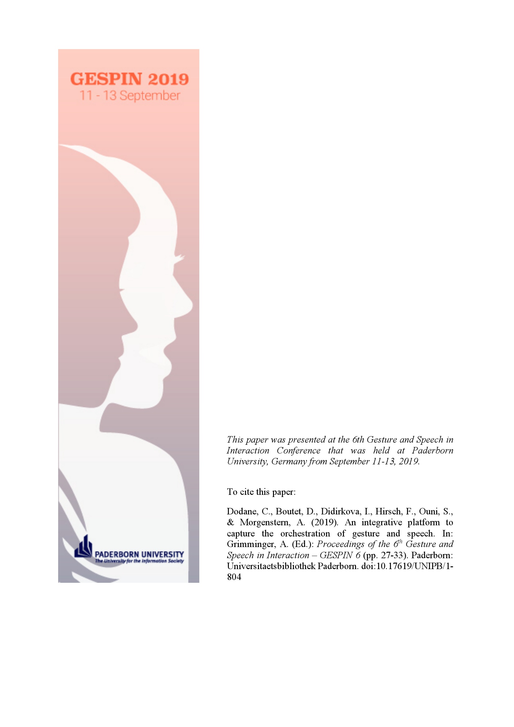 An integrative platform to capture the orchestration of gesture and speech / Christelle Dodane, Dominique Boutet, Ivana Didirkova, Fabrice Hirsch, Slim Ouni and Aliyah Morgenstern