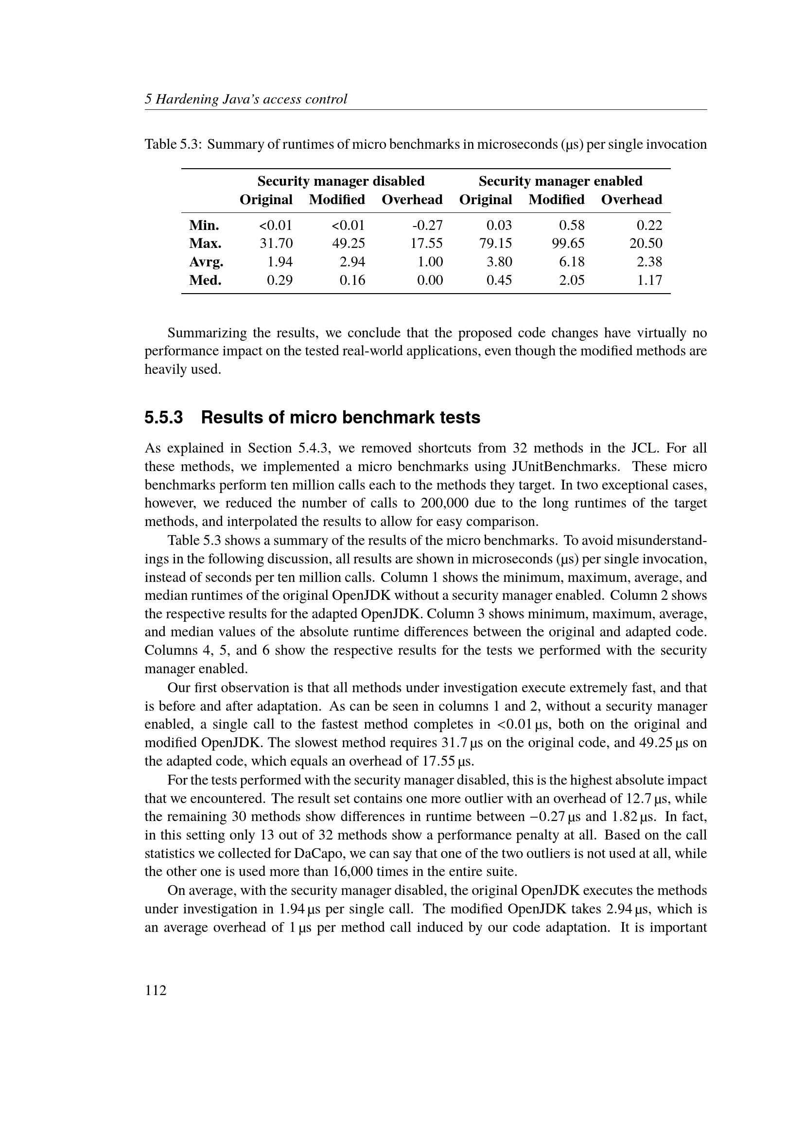 Results of micro benchmark tests