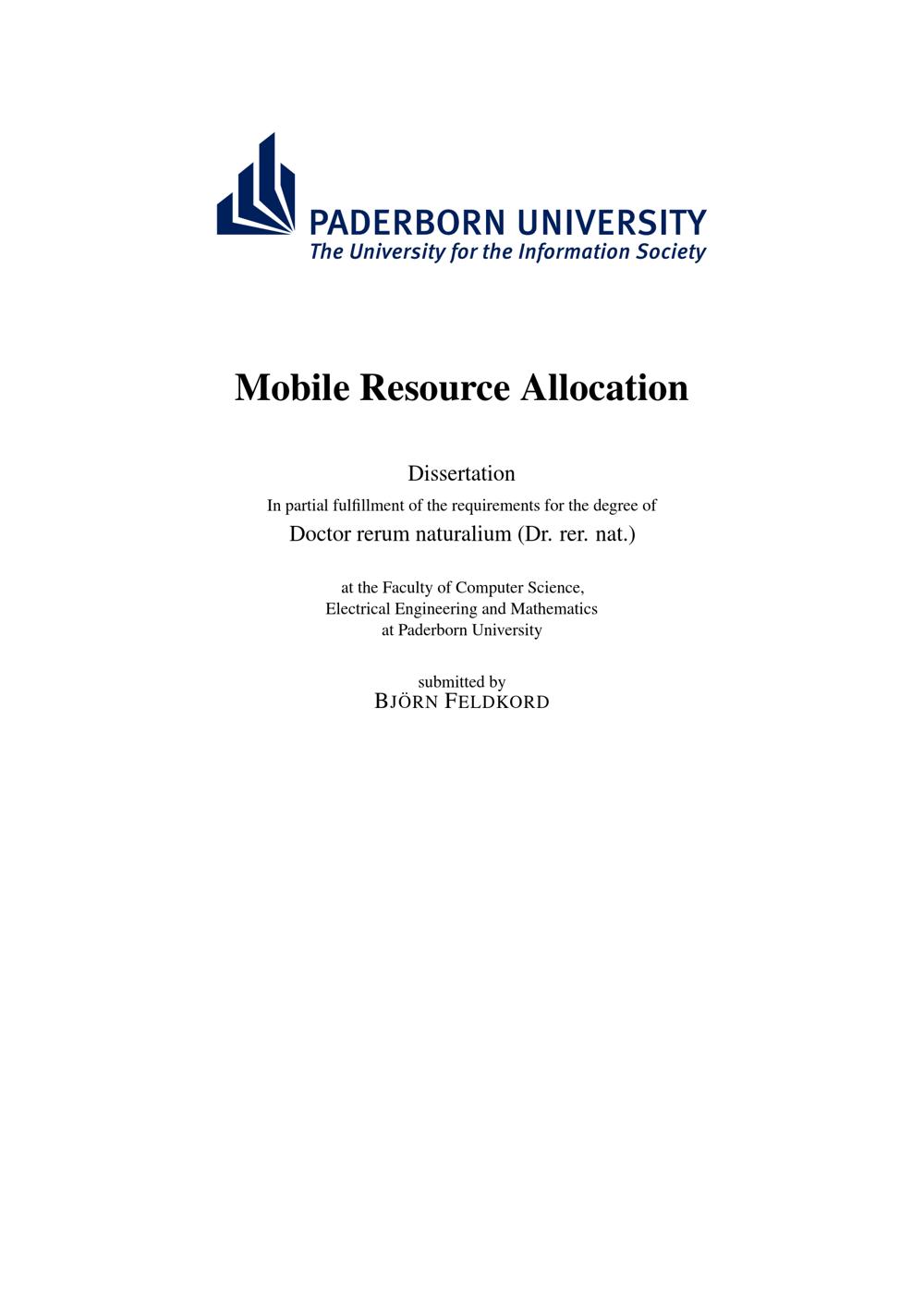 Mobile resource allocation / submitted by Björn Feldkord ; [Reviewers: Prof. Dr. Friedhelm Meyer auf der Heide, Paderborn University, Dr. habil. Marcin Bieńkowski, Wrocław University]