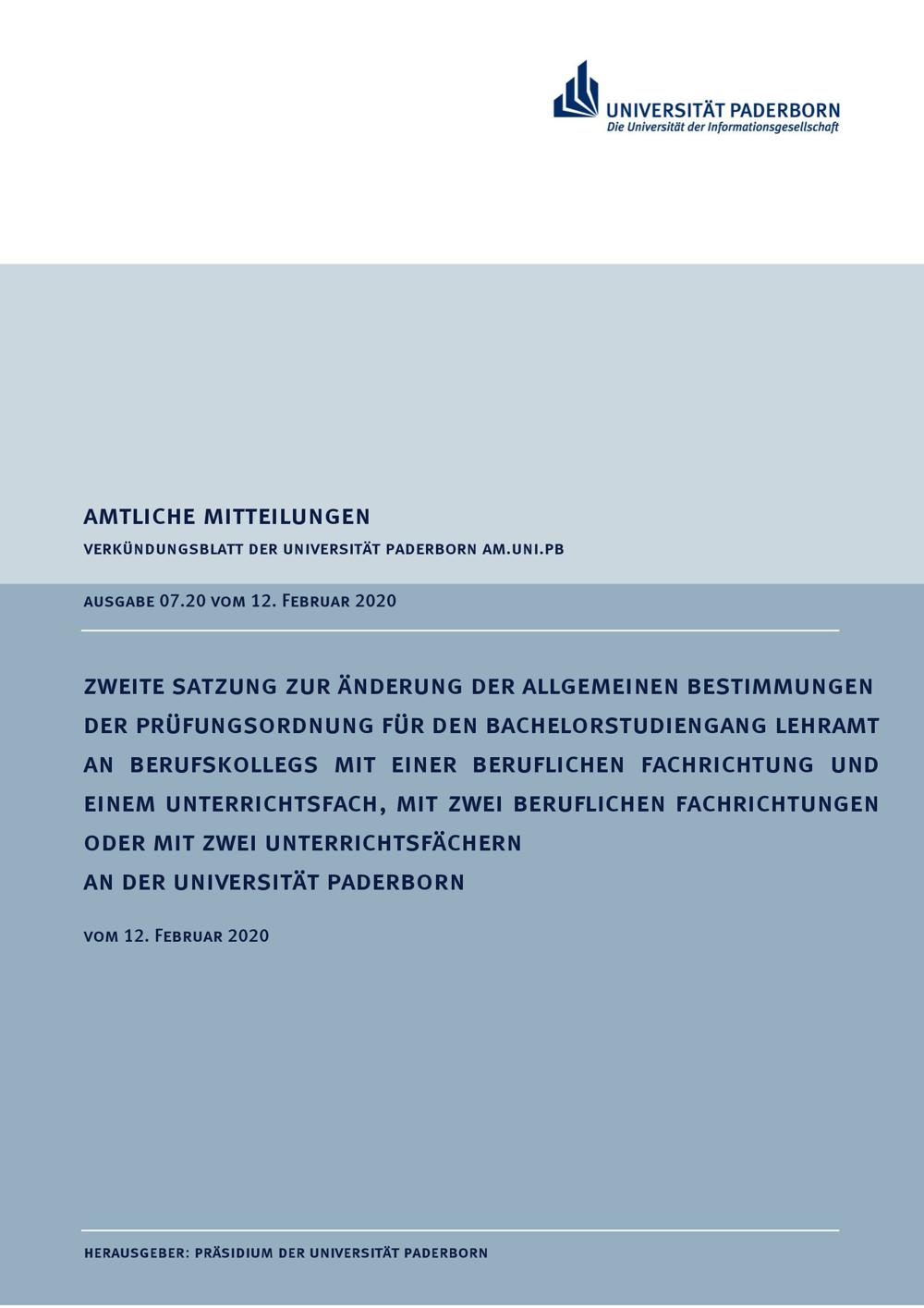 Zweite Satzung zur Änderung der Allgemeinen Bestimmungen der Prüfungsordnung für den Bachelorstudiengang Lehramt an Berufskollegs mit einer beruflichen Fachrichtung und einem Unterrichtsfach, mit zwei beruflichen Fachrichtungen oder mit zwei Unterrichtsfächern an der Universität Paderborn : vom 12. Februar 2020