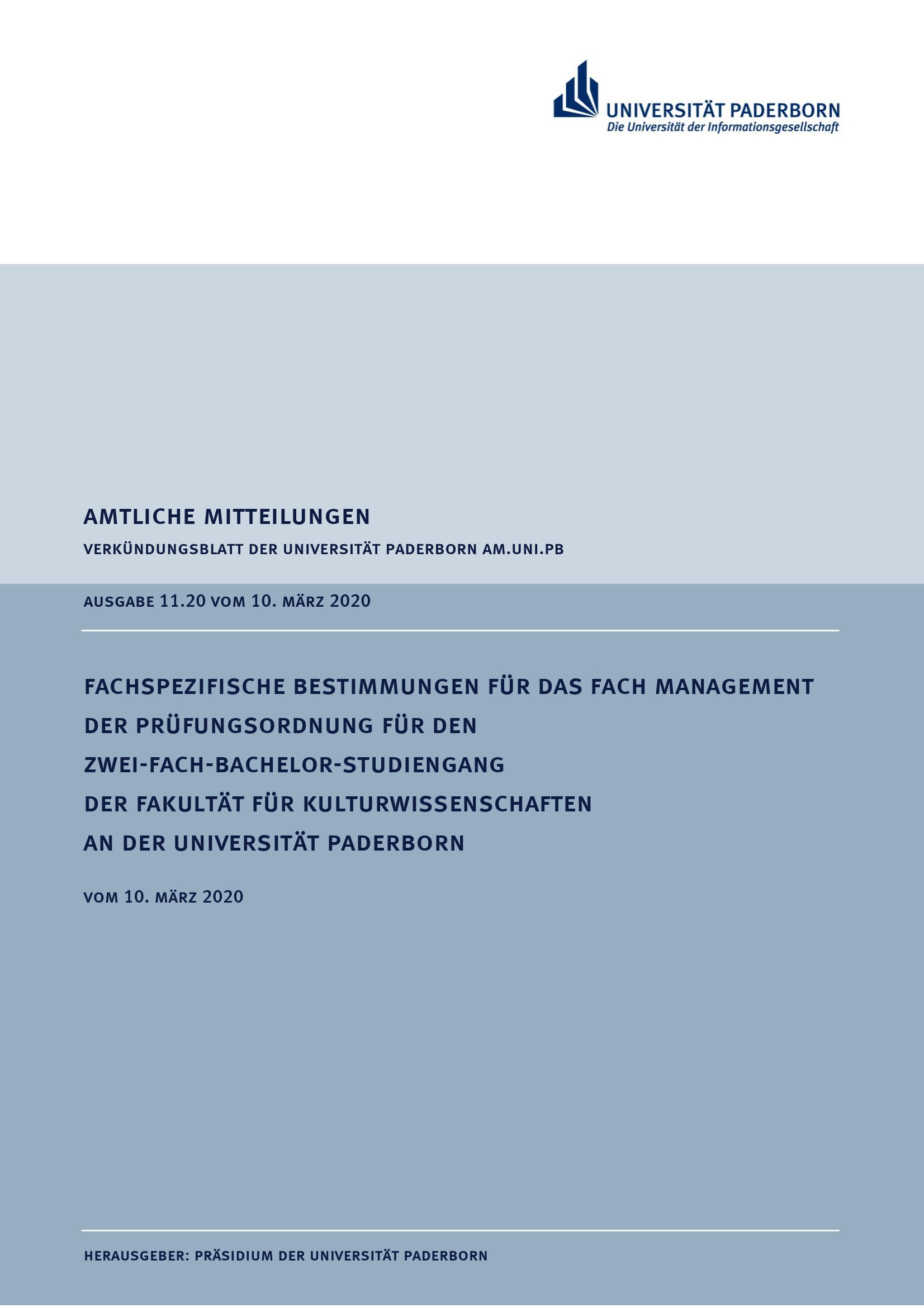 Fachspezifische Bestimmungen für das Fach Management der Prüfungsordnung für den Zwei-Fach-Bachelor-Studiengang der Fakultät für Kulturwissenschaften an der Universität Paderborn : vom 10. März 2020