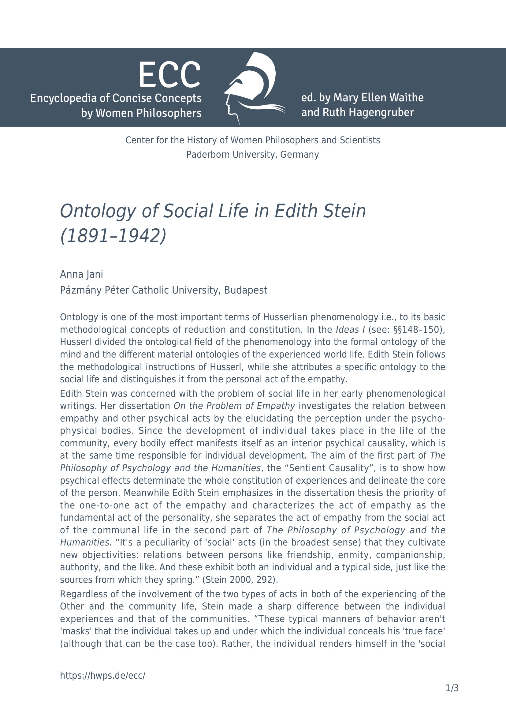Ontology of social life in Edith Stein (1891-1942) / Anna Jani (Pázmány Péter Catholic University, Budapest)