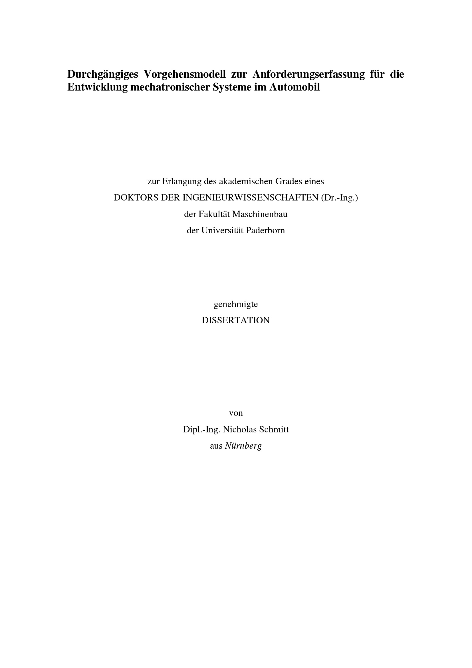 Durchgängiges Vorgehensmodell zur Anforderungserfassung für die Entwicklung mechatronischer Systeme im Automobil / von Dipl.-Ing. Nicholas Schmitt