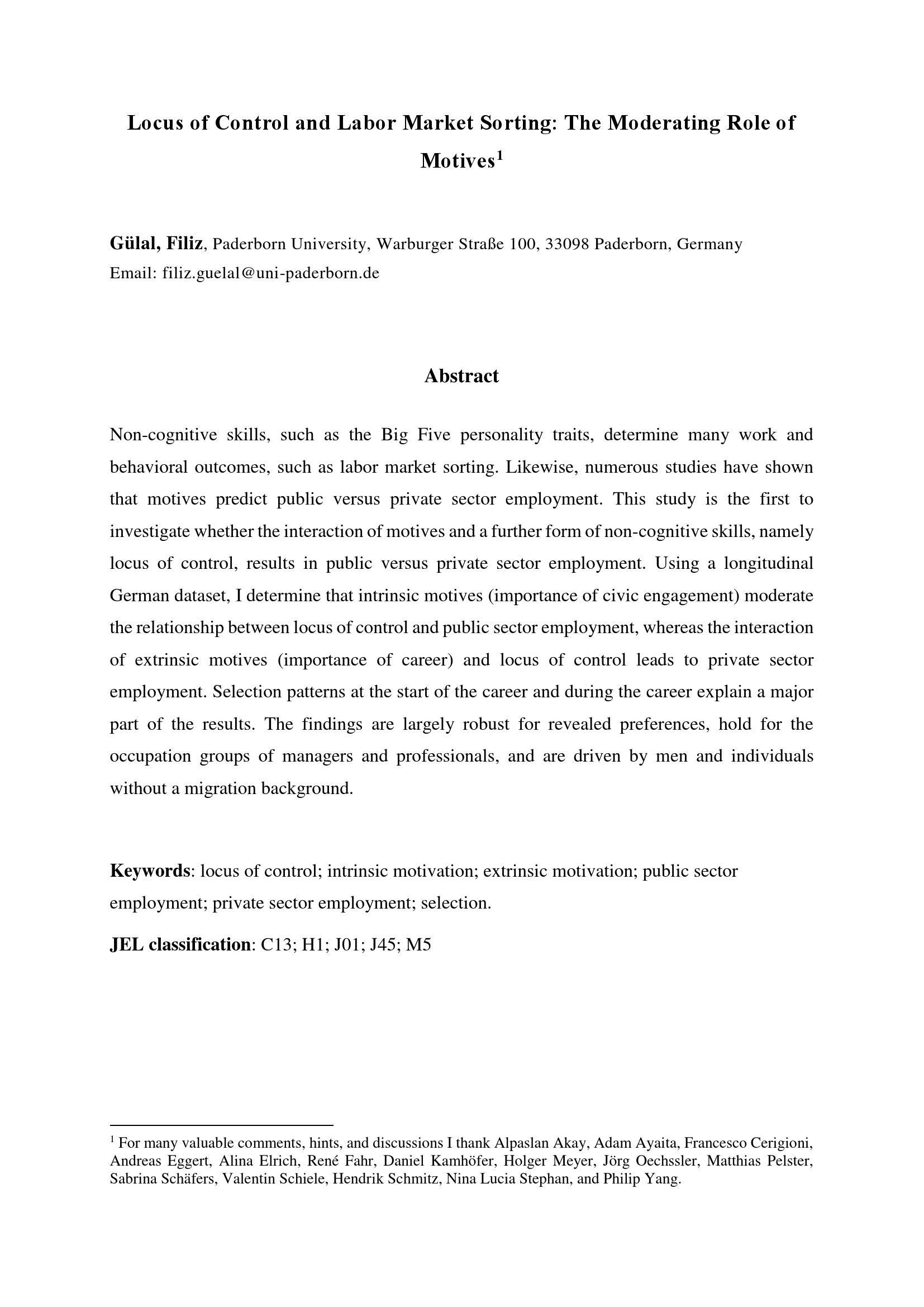 Locus of control and labor market sorting: the moderating role of motives / Filiz Gülal