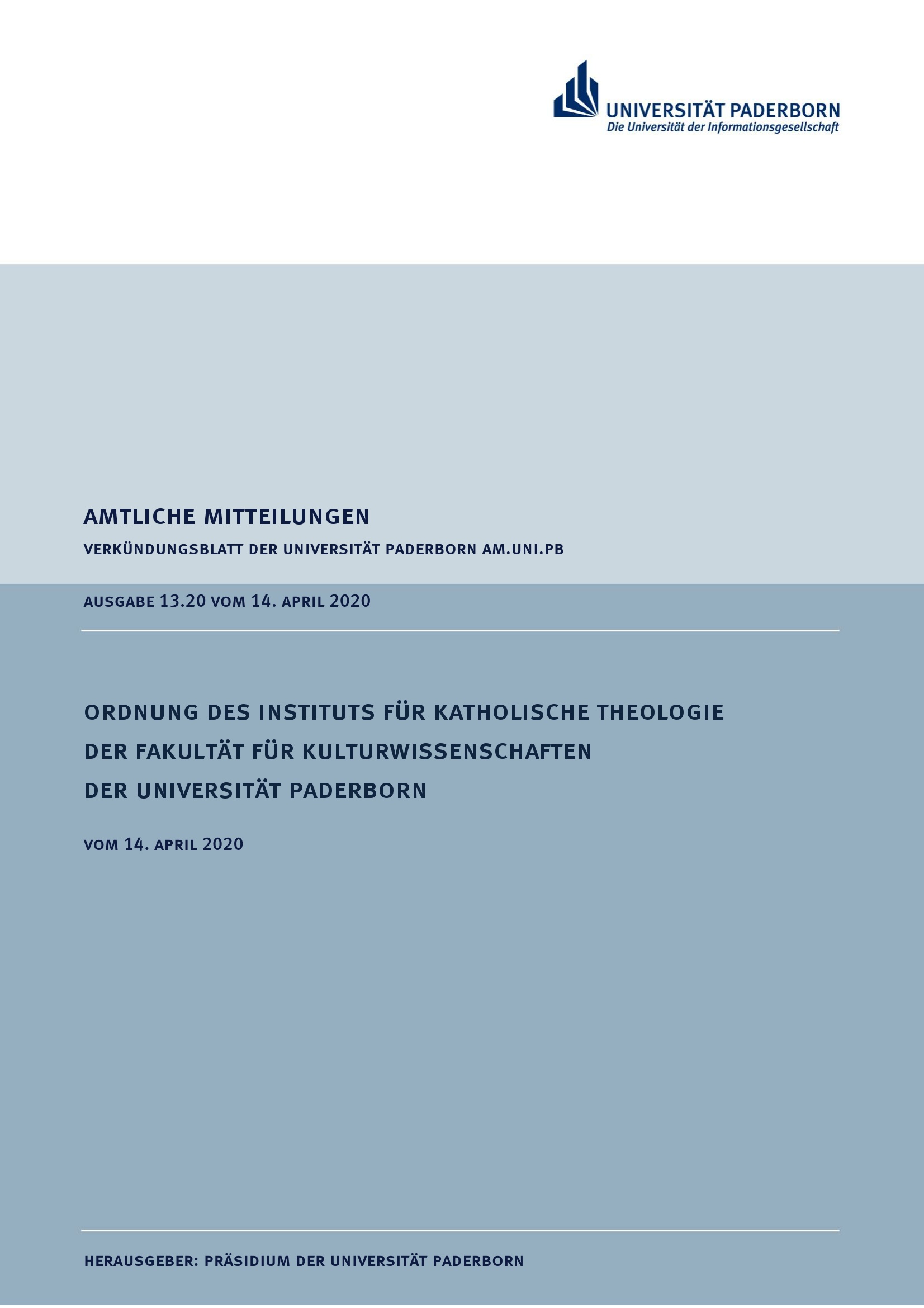 Ordnung des Instituts für Katholische Theologie der Fakultät für Kulturwissenschaften der Universität Paderborn : vom 14. April 2020