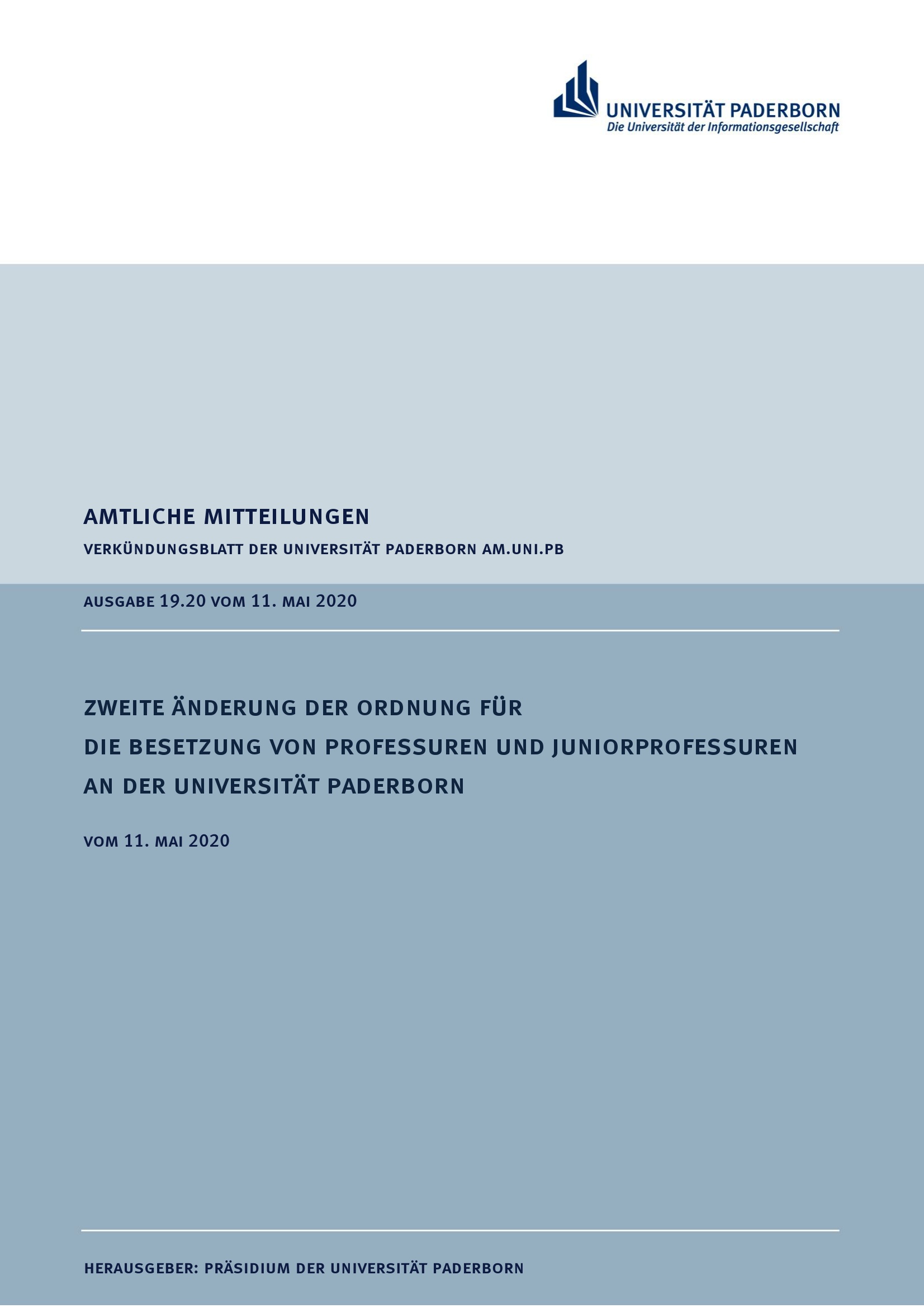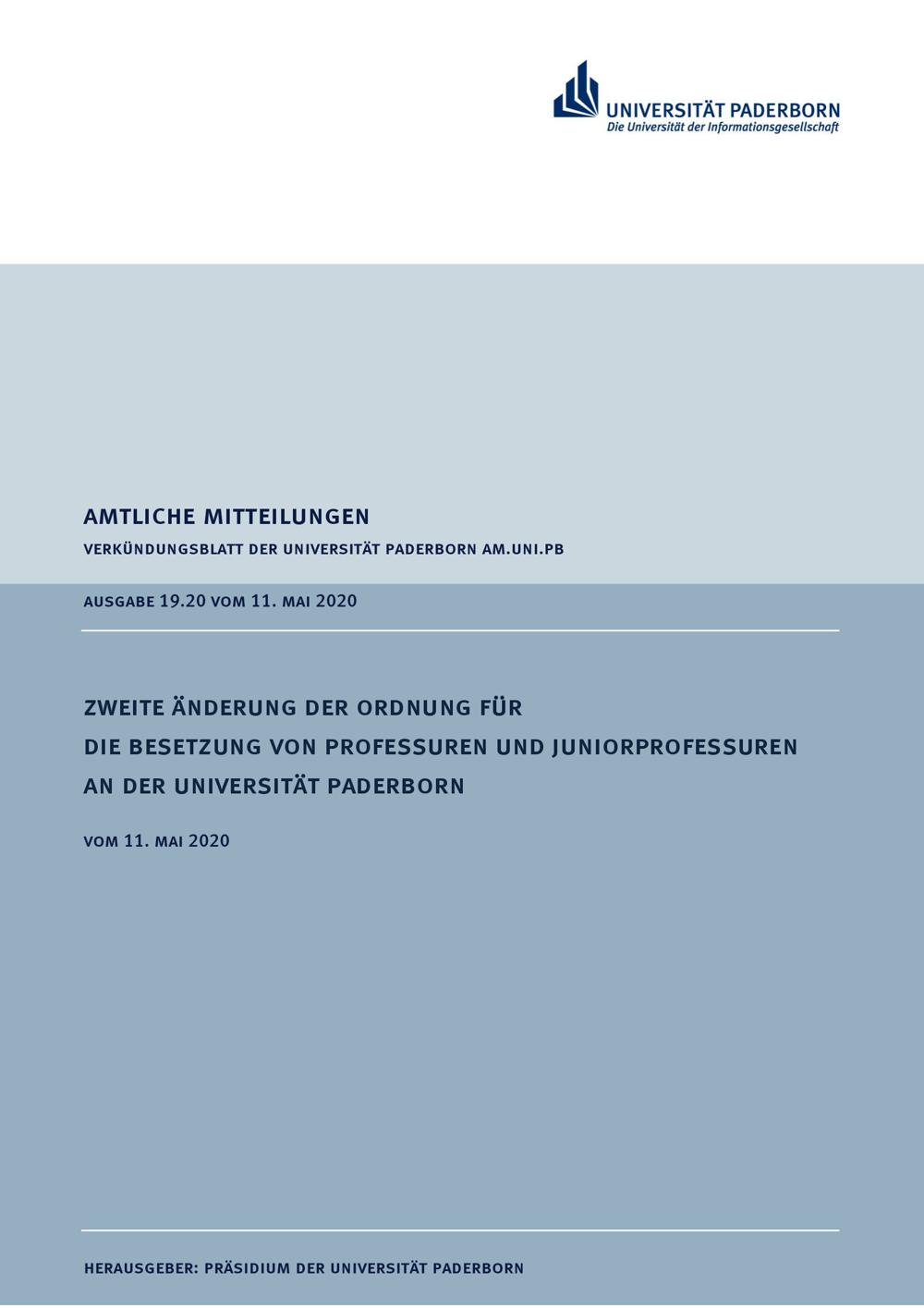 Zweite Änderung der Ordnung für die Besetzung von Professuren und Juniorprofessuren an der Universität Paderborn : vom 11. Mai 2020