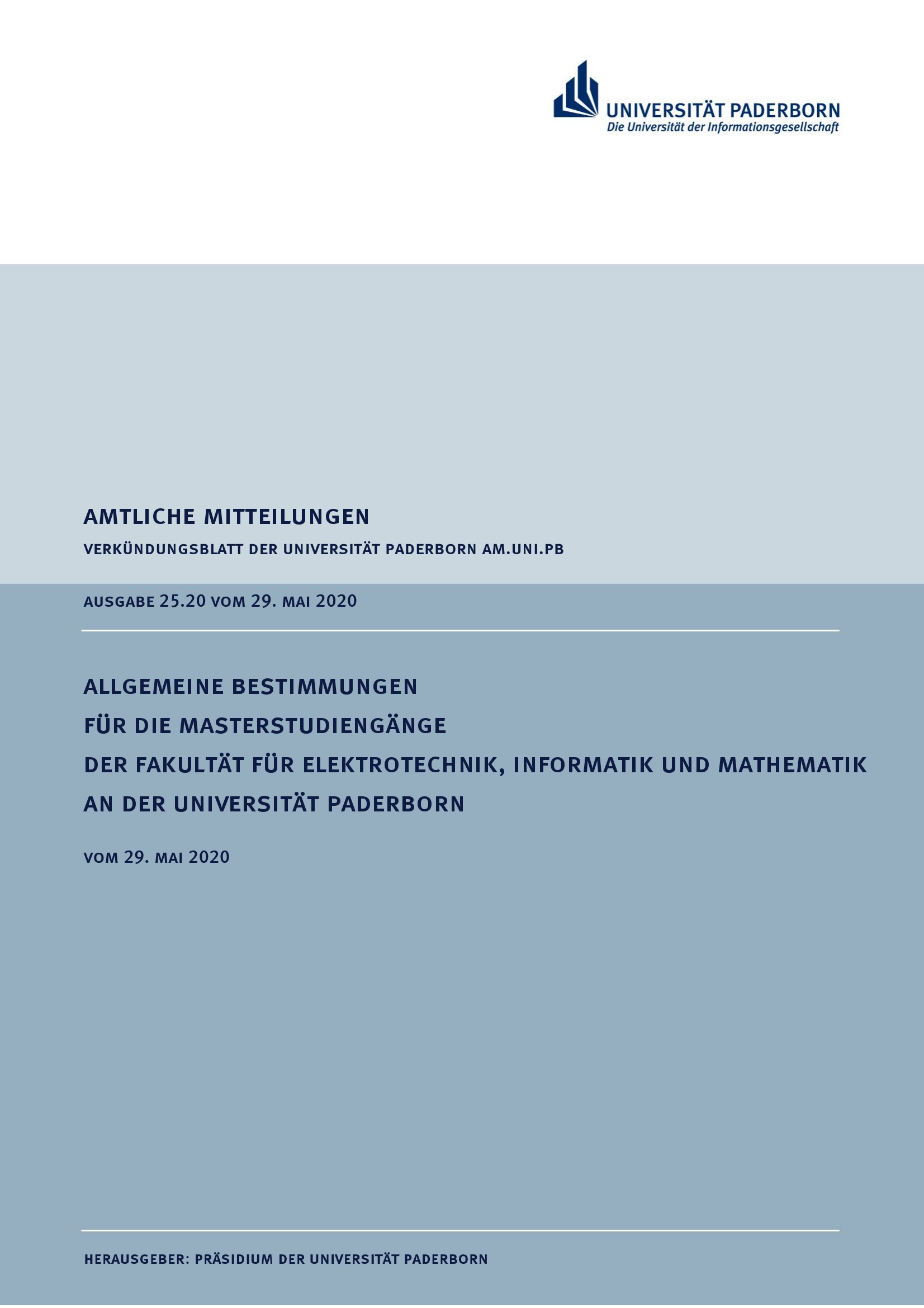 Allgemeine Bestimmungen für die Masterstudiengänge der Fakultät für Elektrotechnik, Informatik und Mathematik an der Universität Paderborn : vom 29. Mai 2020