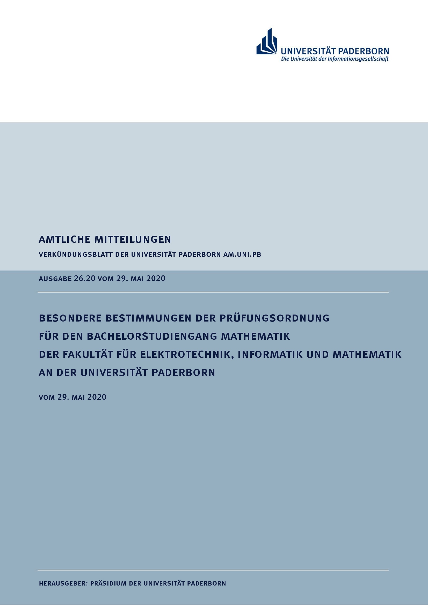 Besondere Bestimmungen der Prüfungsordnung für den Bachelorstudiengang Mathematik der Fakultät für Elektrotechnik, Informatik und Mathematik an der Universität Paderborn : vom 29. Mai 2020