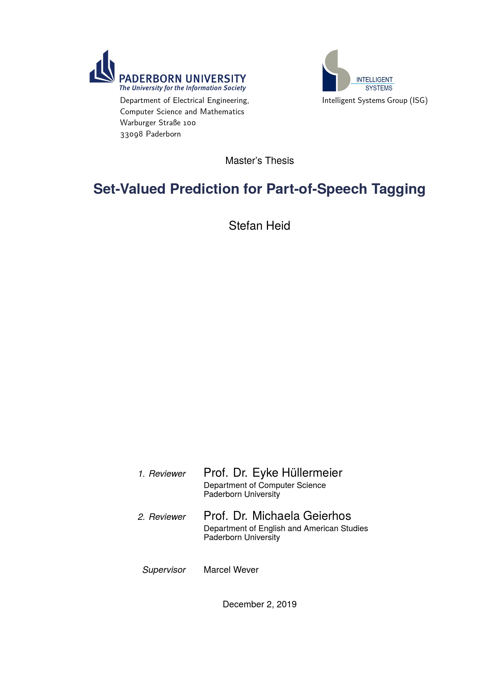 Set-Valued prediction for Part-of-Speech tagging / Stefan Heid ; 1. Reviewer Prof. Dr. Eyke Hüllermeier, 2. Reviewer Prof. Dr. Michaela Geierhos