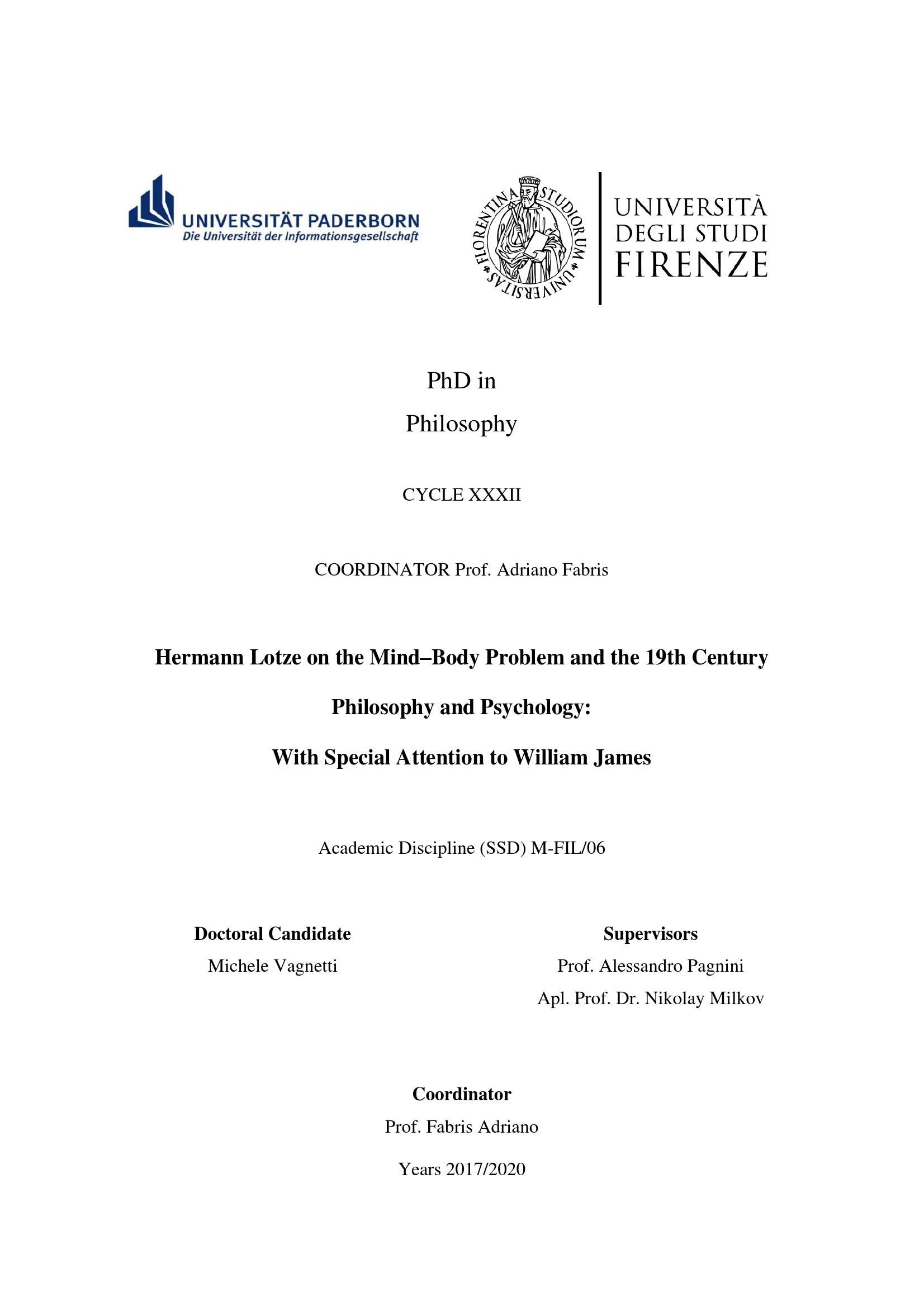 Hermann Lotze on the mind-body problem and the 19th century philosophy and psychology : with special attention to William James / Michele Vagnetti ; Supervisors: Prof. Alessandro Pagnini, Apl. Prof. Dr. Nikolay Milkov