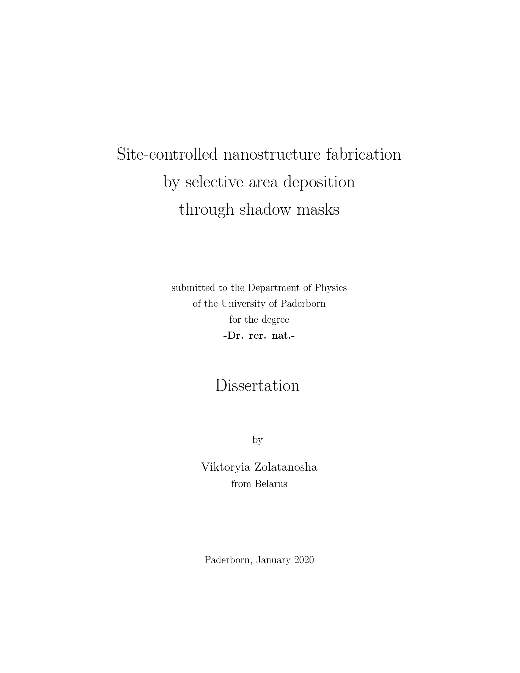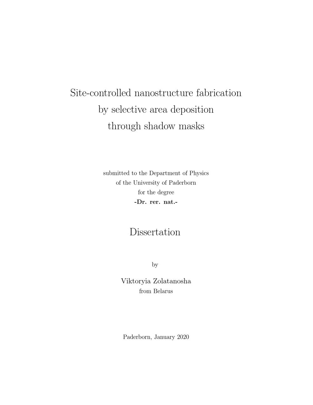 Site-controlled nanostructure fabrication by selective area epitaxy through shadow masks / by Viktoriya Zolatanosha ; [1. Reviewer: Prof. Dr. Dirk Reuter, 2. Reviewer: Prof. Dr. Cedrik Meier]