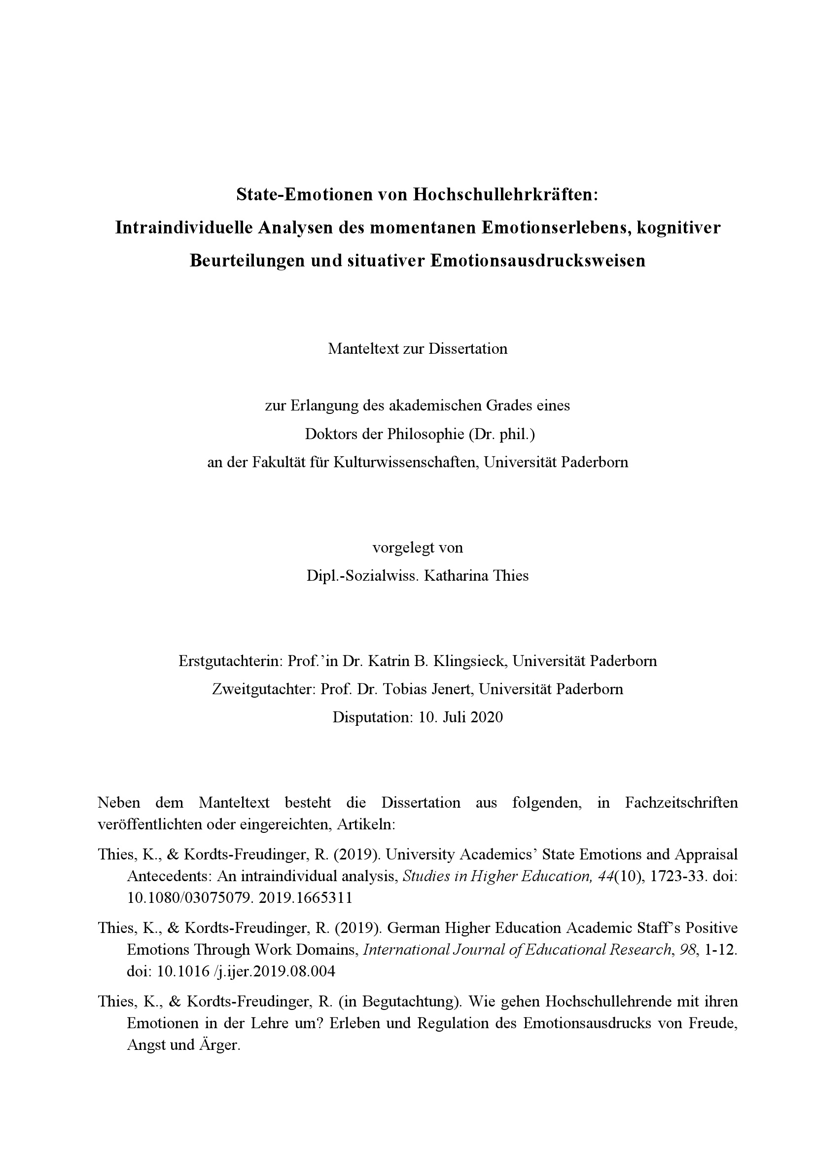 State-Emotionen von Hochschullehrkräften: Intraindividuelle Analysen des momentanen Emotionserlebens, kognitiver Beurteilungen und situativer Emotionsausdrucksweisen / vorgelegt von Dipl.-Sozialwiss. Katharina Thies ; Erstgutachterin: Prof.'in Dr. Katrin B. Klingsieck, Universität Paderborn, Zweitgutachter: Prof. Dr. Tobias Jenert, Universität Paderborn