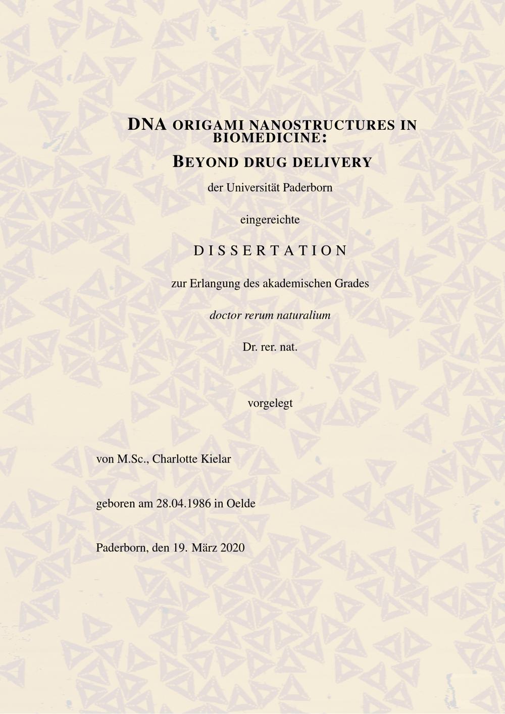 DNA origami nanostructures in biomedicine: Beyond drug delivery / vorgelegt von M.Sc., Charlotte Kielar ; [Erstgutachter: PD Dr. Adrian Keller, Zweitgutachter: Prof. Dr. Ilko Bald, Drittgutachter: Prof. Dr. Guido Grundmeier]