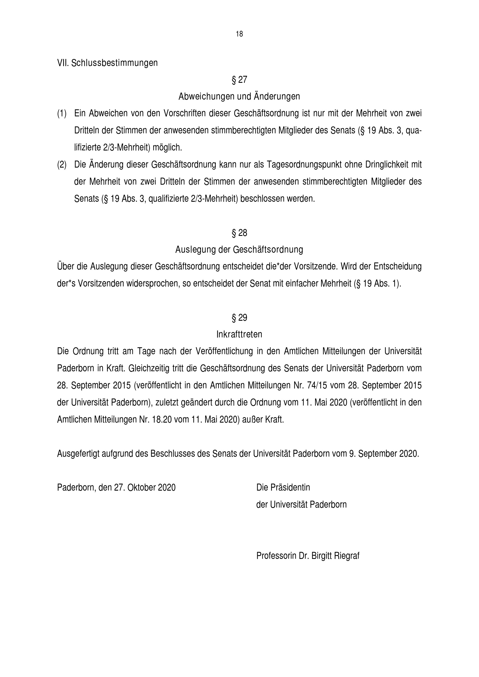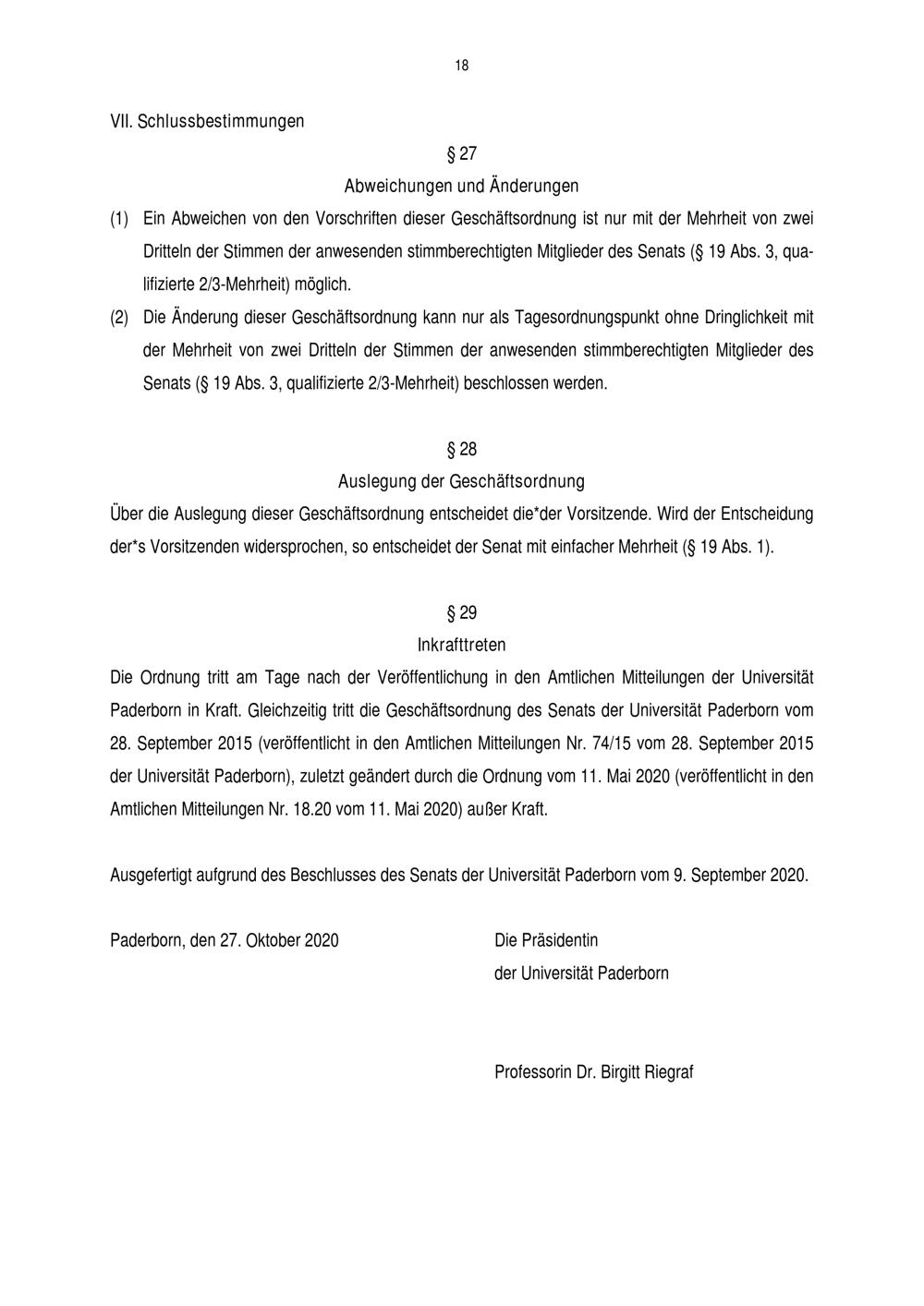 Geschäftsordnung für den Senat der Universität Paderborn : vom 27. Oktober 2020