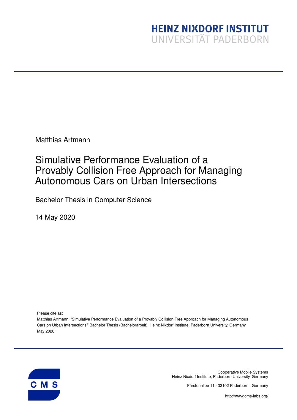 Simulative performance evaluation of a provably collision free approach for managing autonomous cars on urban intersections / vorgelegt von Matthias Artmann ; Betreuer: Christoph Sommer ; Gutachter: Christoph Sommer, Friedhelm Meyer auf der Heide