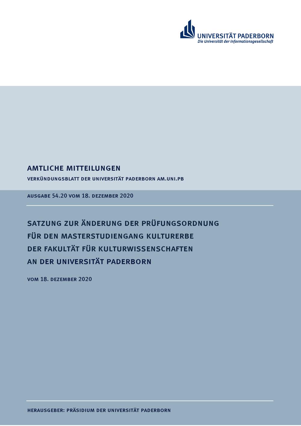 Satzung zur Änderung der Prüfungsordnung für den Masterstudiengang Kulturerbe an der Universität Paderborn : vom 18. Dezember 2020