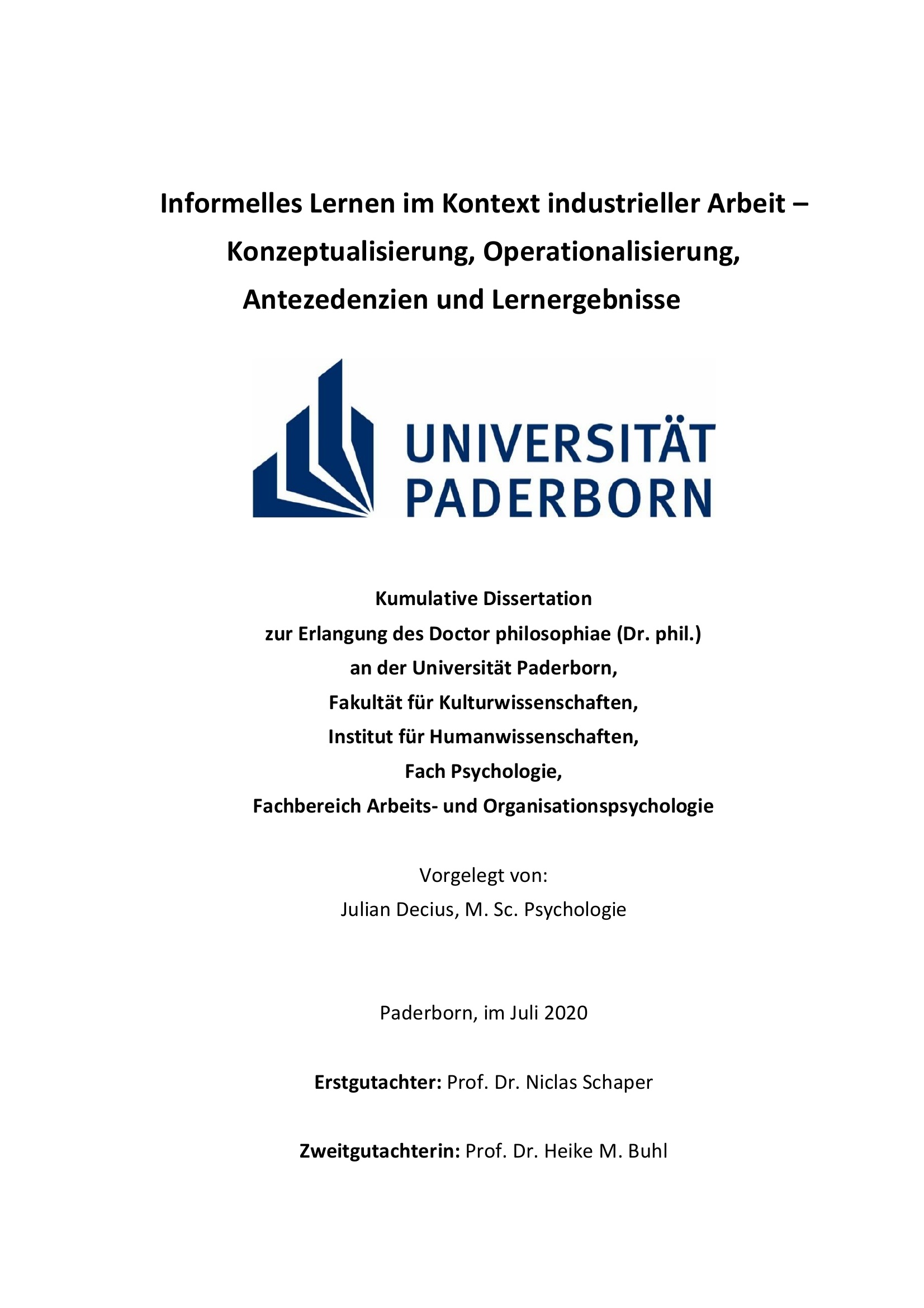 Informelles Lernen im Kontext industrieller Arbeit : Konzeptualisierung, Operationalisierung, Antezedenzien und Lernergebnisse / vorgelegt von: Julian DEcius, M. Sc. Psychologie ; Erstgutachter: Prof. Dr. Niclas Schaper, Zweitgutachterin: Prof. Dr. Heike M. Buhl