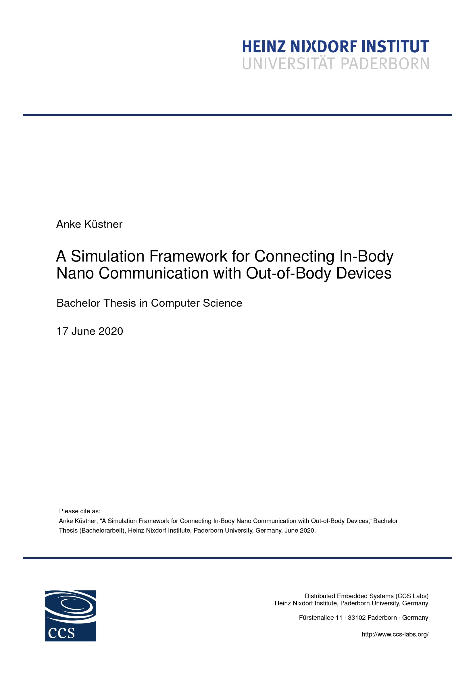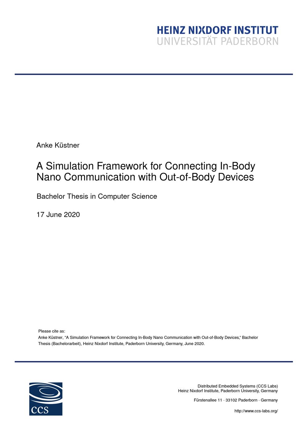 A simulation framework for connecting In-Body nano communication with Out-of-Body devices / vorgelegt von Anke Küstner ; angefertigt in der Fachgruppe Distributed Embedded Systems (CCS Labs), Heinz Nixdorf Institut, Universität Paderborn ; Gutachter: Falko Dressler, Holger Karl