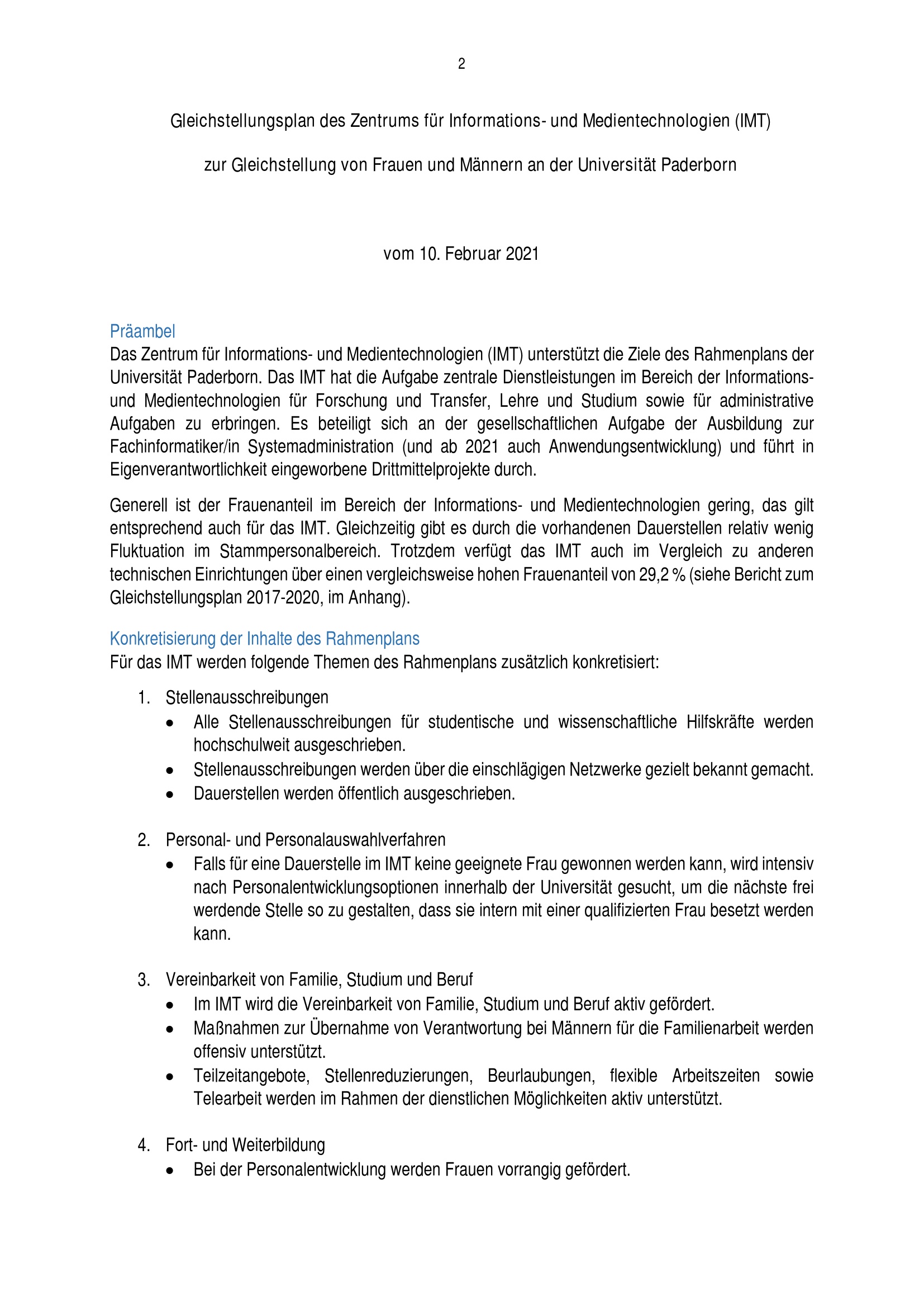 Gleichstellungsplan des Zentrums für Informations- und Medientechnologien (IMT) zur Gleichstellung von Frauen und Männern an der Universität Paderborn : vom 10. Februar 2021