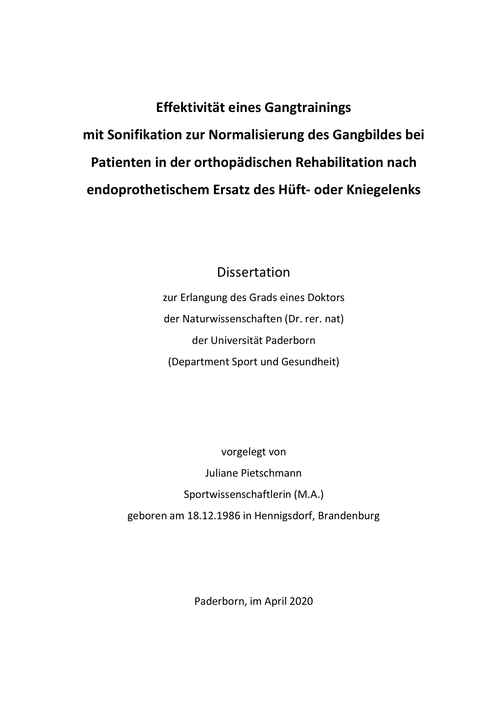 Effektivität eines Gangtrainings mit Sonifikation zur Normalisierung des Gangbildes bei Patienten in der orthopädischen Rehabilitation nach endoprothetischem Ersatz des Hüft- oder Kniegelenks / vorgelegt von Juliane Pietschmann, Sportwissenschaftlerin (M.A.) ; [1. Gutachter: Prof. Dr. Thomas Jöllenbeck, 2. Gutachter: Prof. Dr. Jürgen Freiwald, 3. Gutachter: Prof. Dr. Hans-Christian Heitkamp]