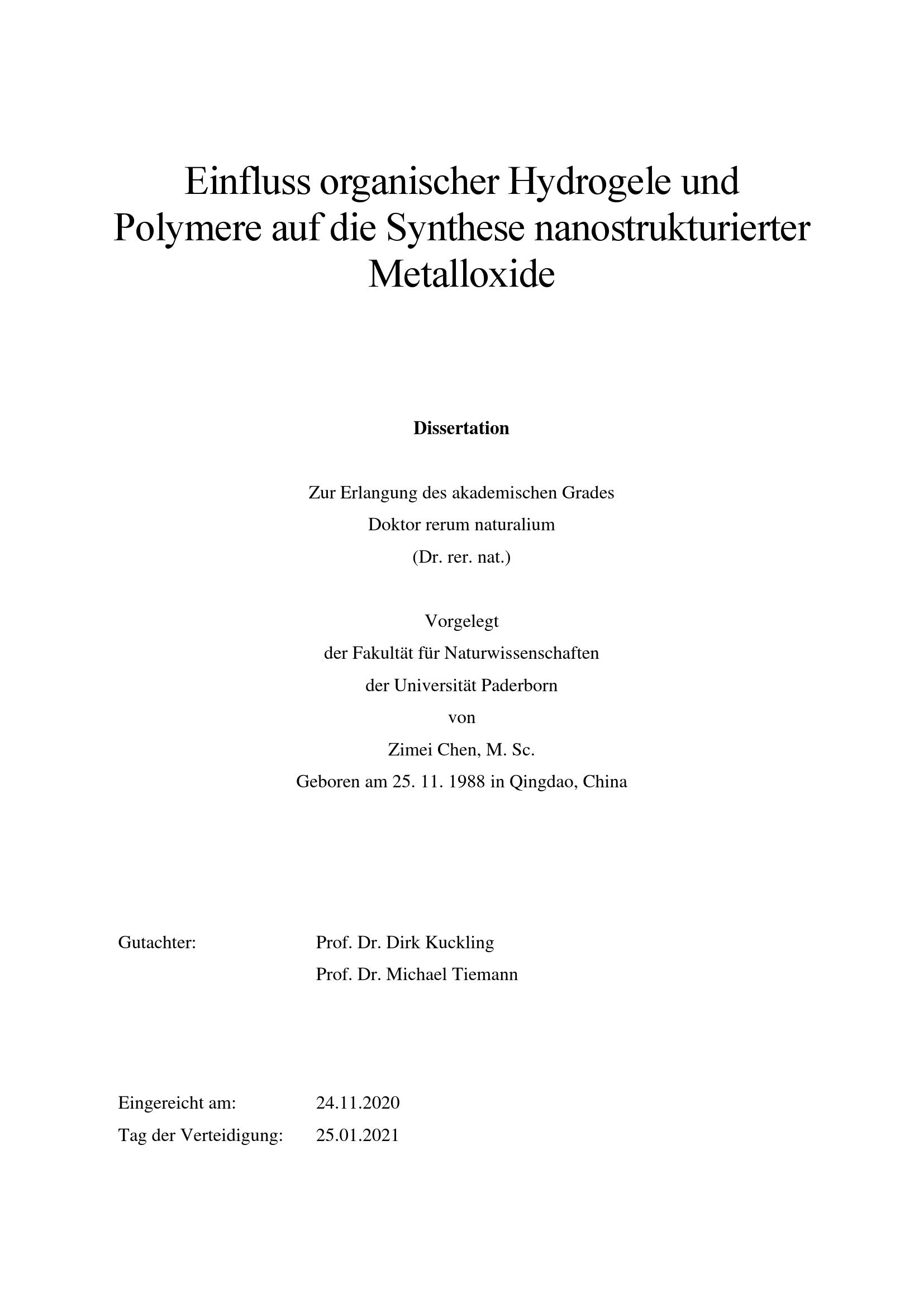 Einfluss organischer Hydrogele und Polymere auf die Synthese nanostrukturierter Metalloxide / von Zimei Chen, M. Sc. ; Gutachter: Prof. Dr. Dirk Kuckling, Prof. Dr. Michael Tiemann