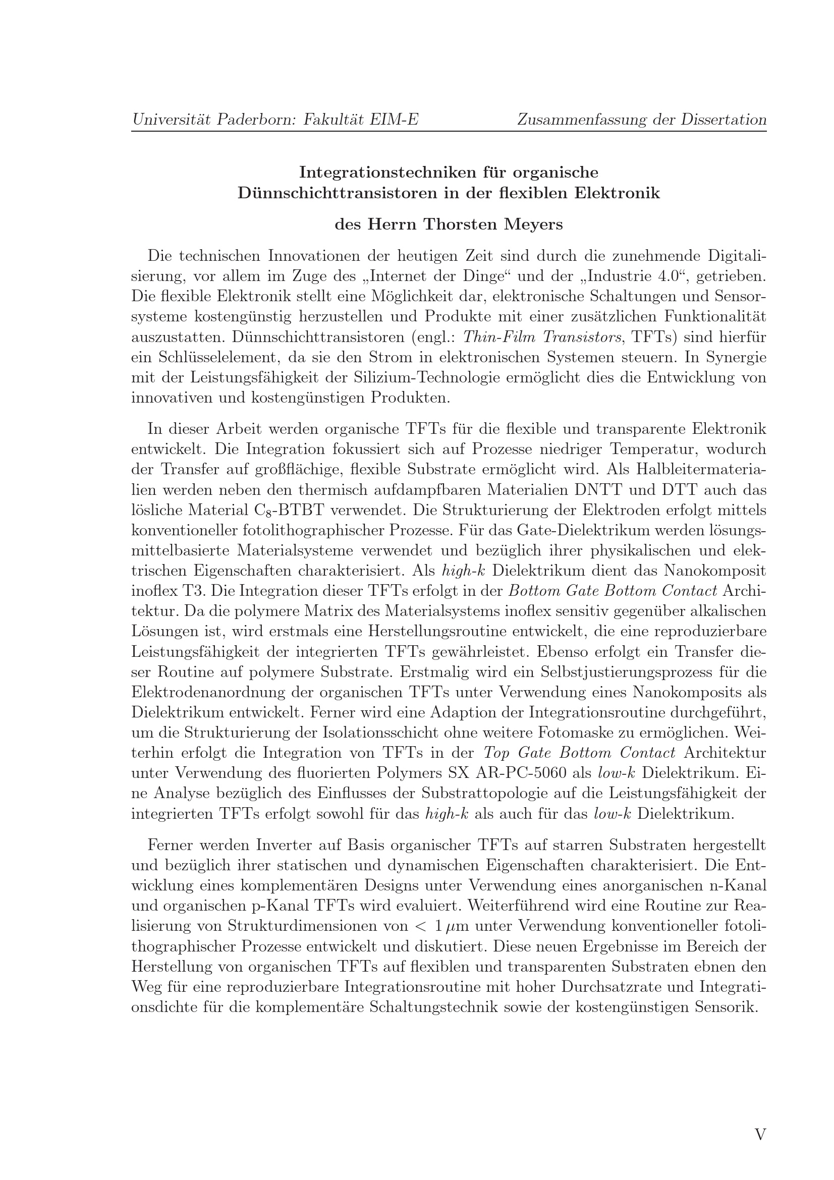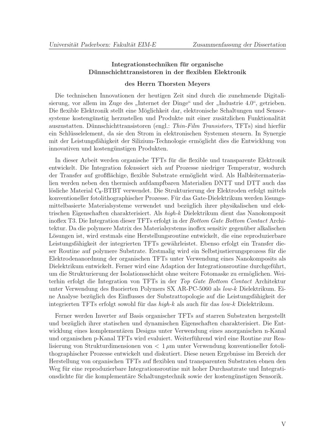 Integrationstechniken für organische Dünnschichttransistoren in der flexiblen Elektronik / von Thorsten Meyers, M.Sc. ; Erster Gutachter: Prof. Dr.-Ing. Ulrich Hilleringmann, Zweiter Gutachter: Prof. Dr. rer. nat. Jörg K. N. Lindner