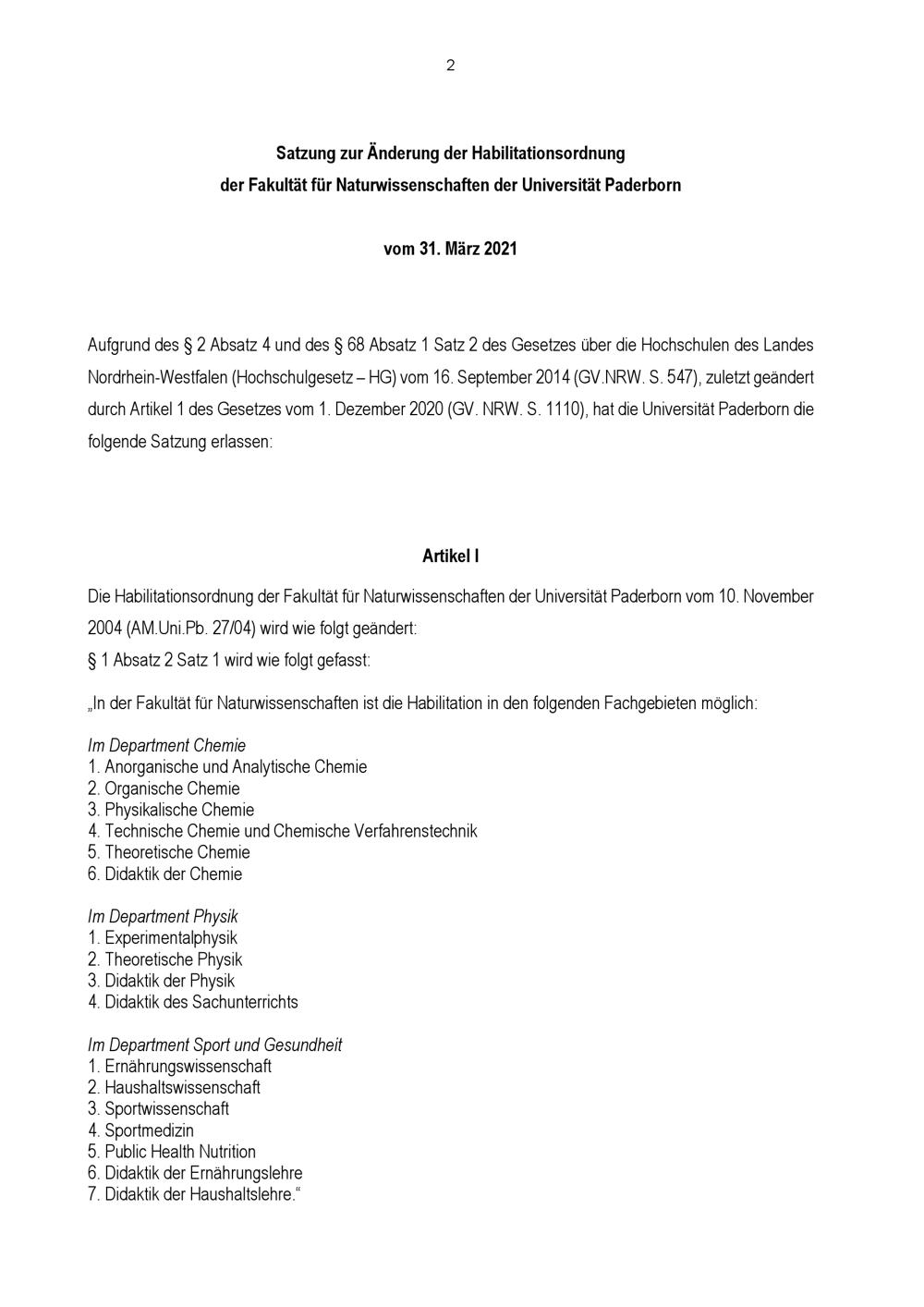 Satzung zur Änderung der Habilitationsordnung der Fakultät für Naturwissenschaften an der Universität Paderborn : vom 31. März 2021