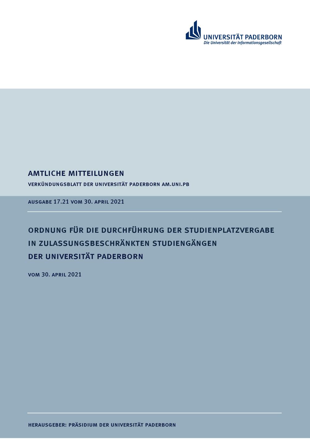 Ordnung für die Durchführung der Studienplatzvergabe in zulassungsbeschränkten Studiengängen der Universität Paderborn : vom 30. April 2021