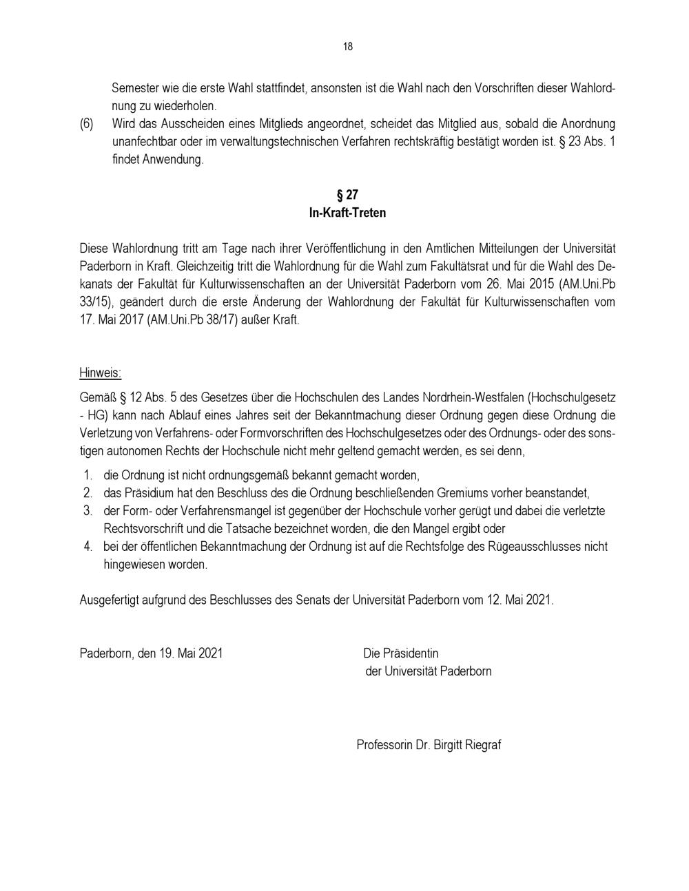 Wahlordnung für die Wahl zum Fakultätsrat und für die Wahl des Dekanats bzw. des*r Dekans*in und des*r Prodekans*in der Fakultät für Kulturwissenschaften an der Universität Paderborn : vom 19. Mai 2021