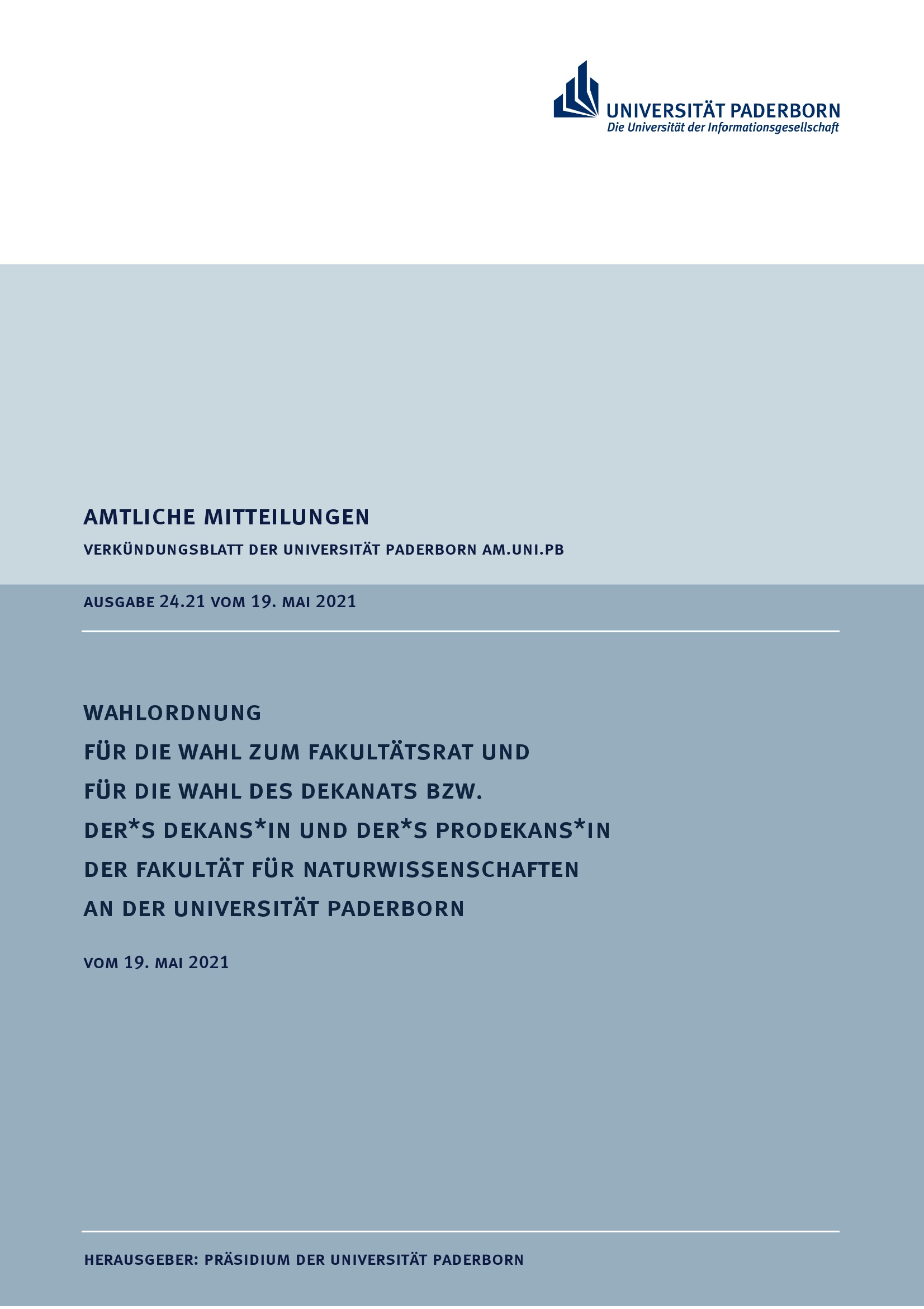 Wahlordnung für die Wahl zum Fakultätsrat und für die Wahl des Dekanats bzw. des*r Dekans*in und des*r Prodekans*in der Fakultät für Naturwissenschaften an der Universität Paderborn : vom 19. Mai 2021